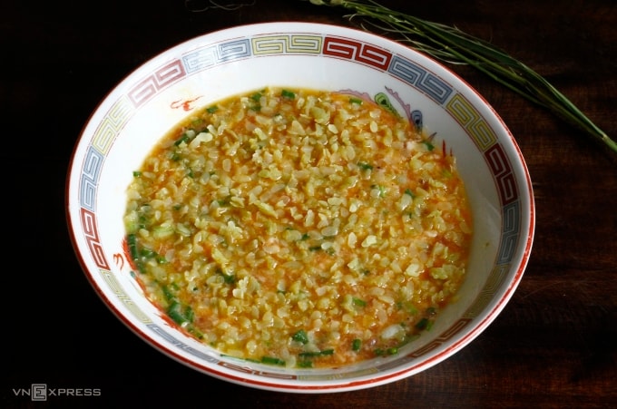 - Cho cốm với lượng vừa đủ, không cho nhiều quá làm trứng chiên cốm bị dẻo đặc quá.
