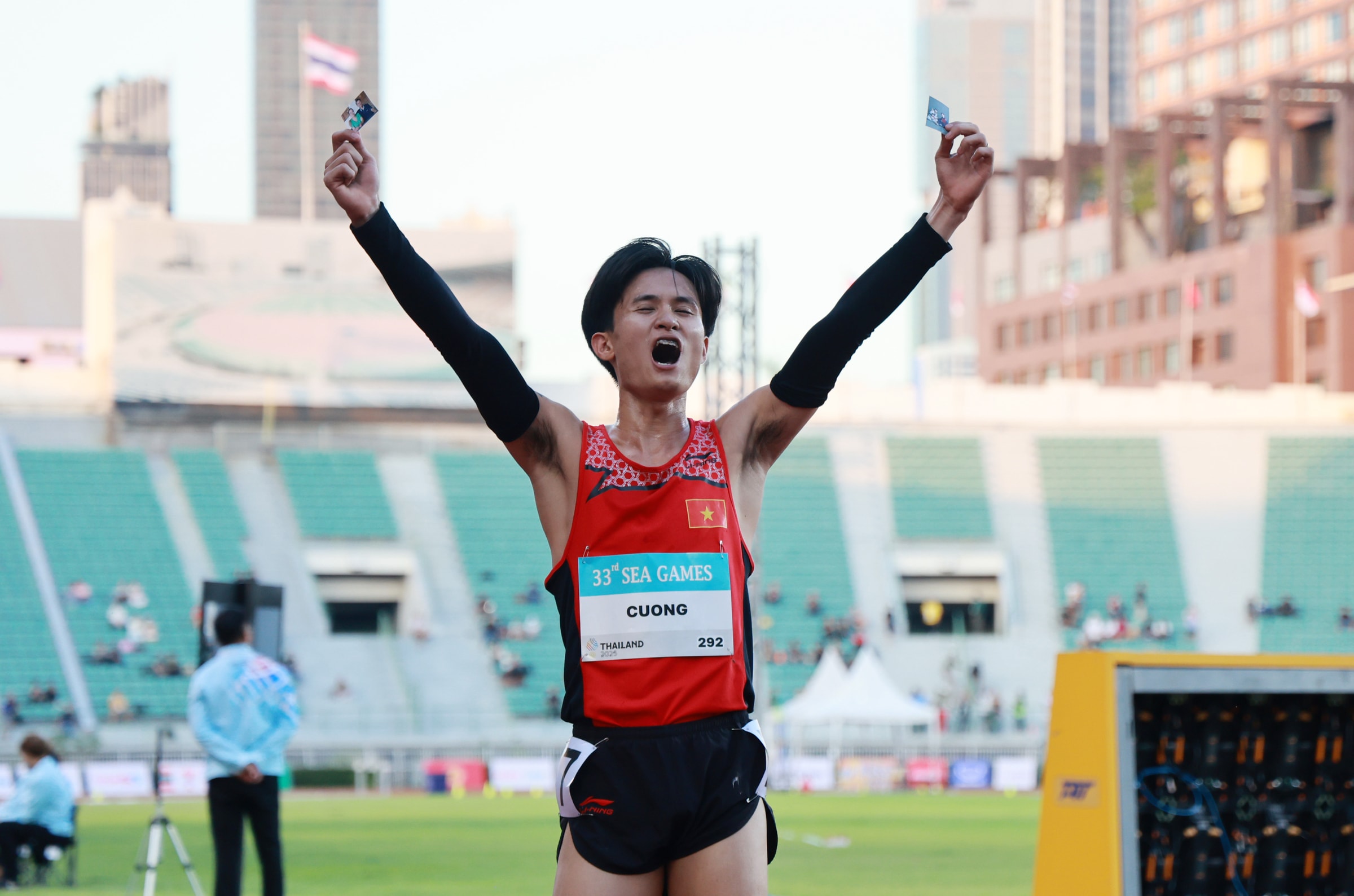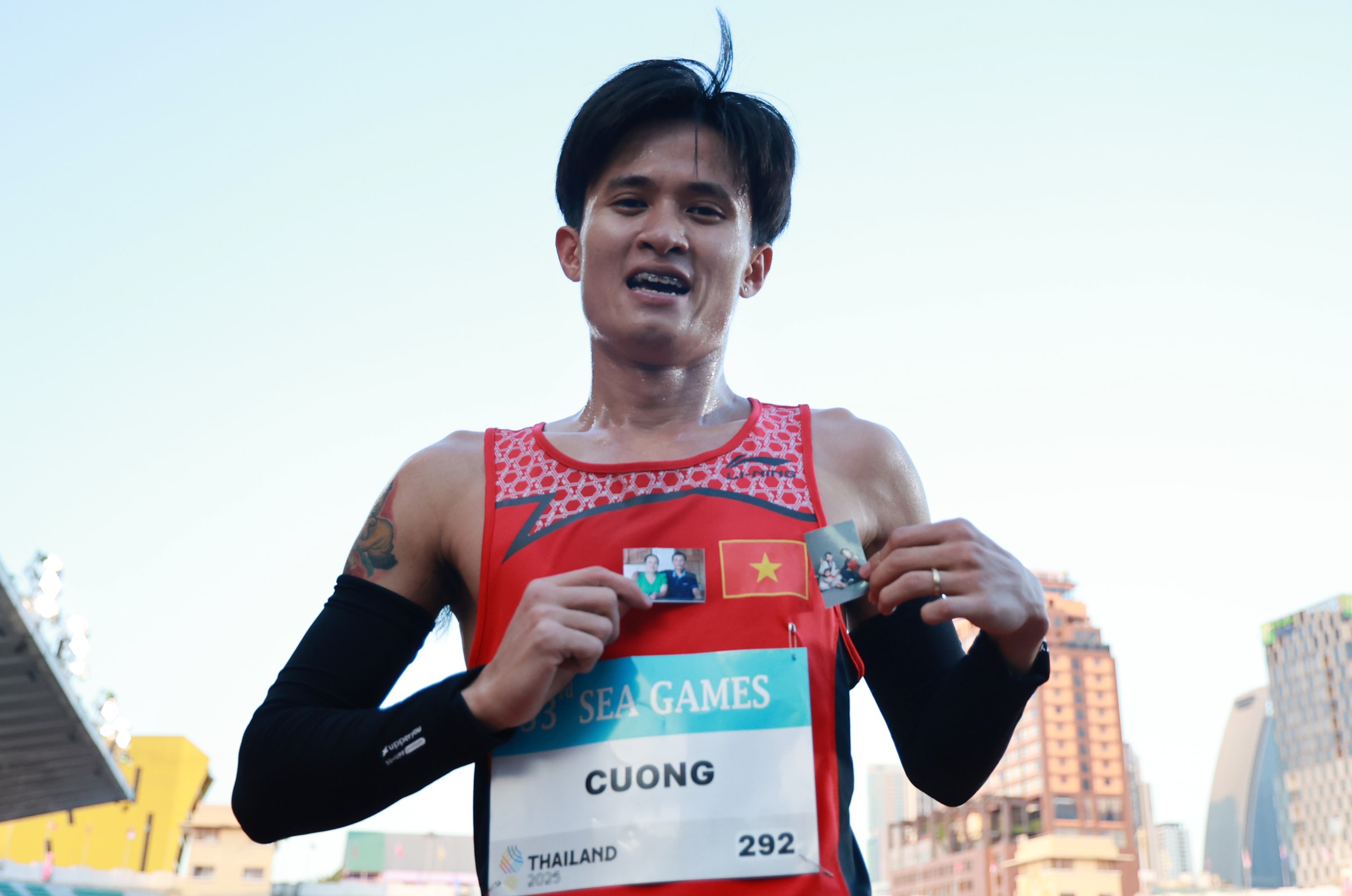 Vì gia đình không có điều kiện sang Thái Lan cổ vũ, VĐV Nguyễn Trung Cường cất ảnh bố mẹ và vợ con trong ống tay để tiếp thêm động lực cho bản thân trên đường đua 3.000m vượt chướng ngại vật SEA Games 33.
