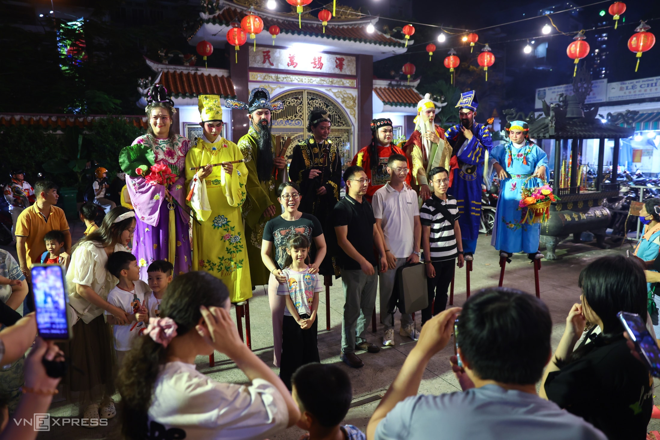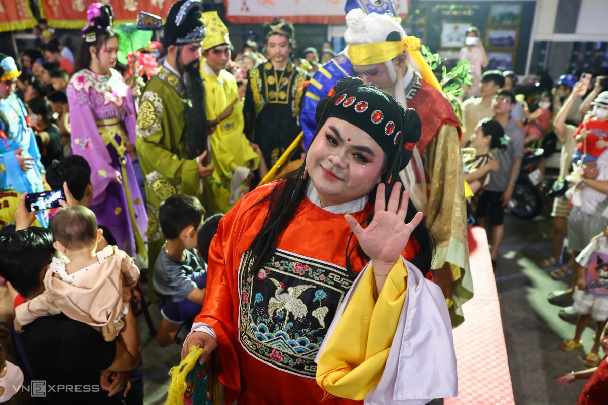 Đây là năm thứ 20 anh cải trang thành nhân vật này ở lễ hội tại miếu Nhị Phủ. "Dù bận rộn mấy thì dịp Trung Thu nào tôi cũng tham gia, được bà con vui vẻ chào đón hạnh phúc lắm", người đàn ông 38 tuổi nói.