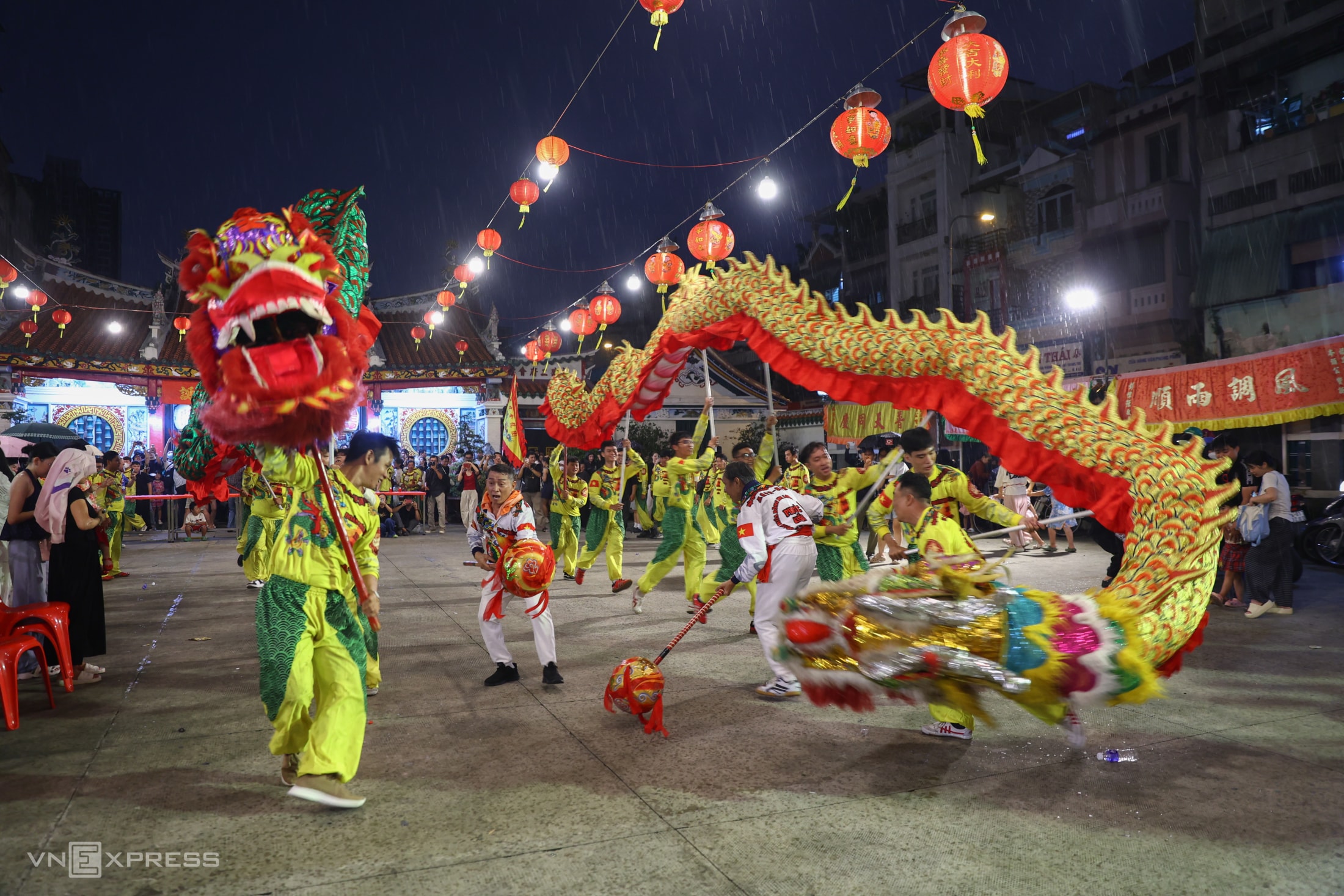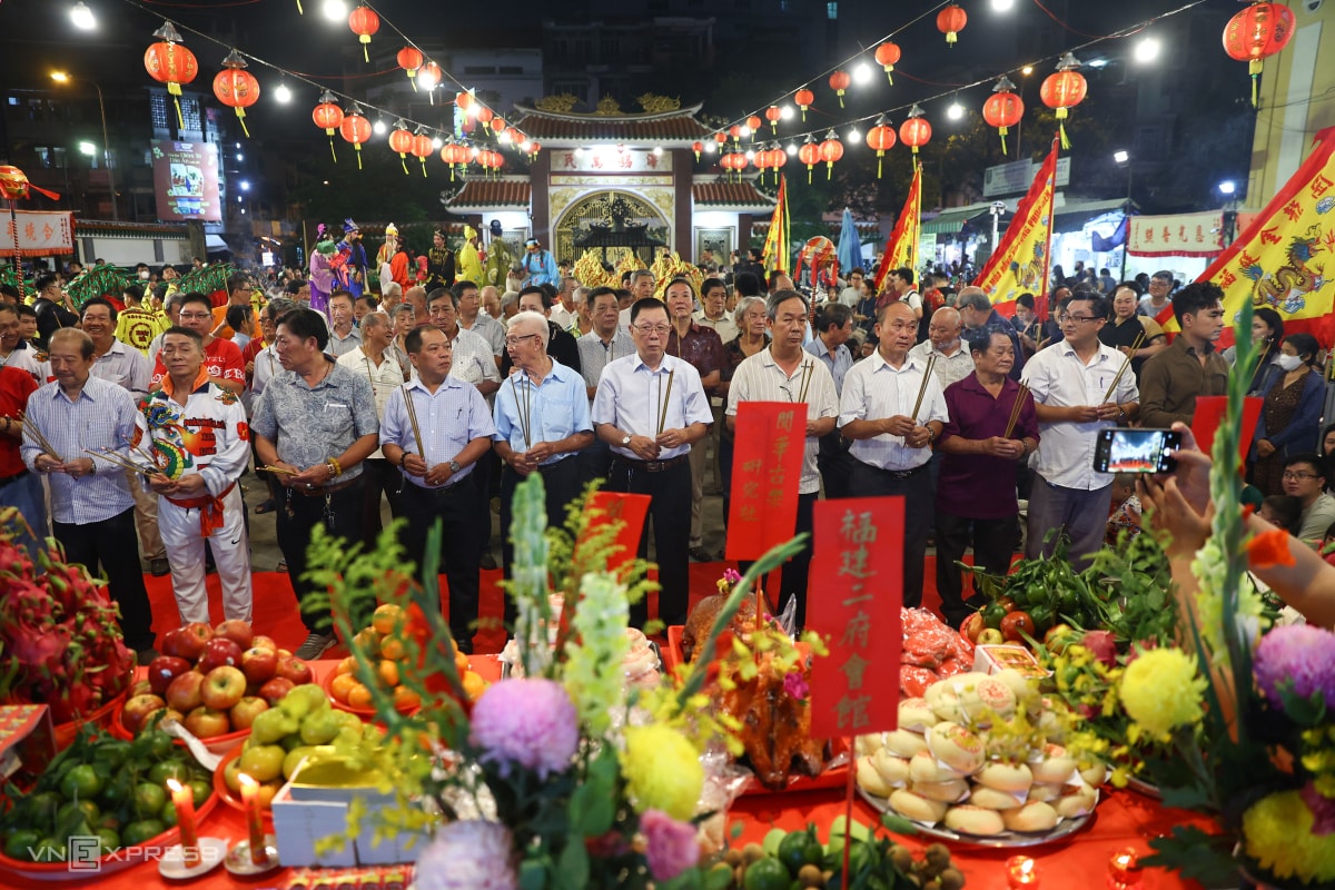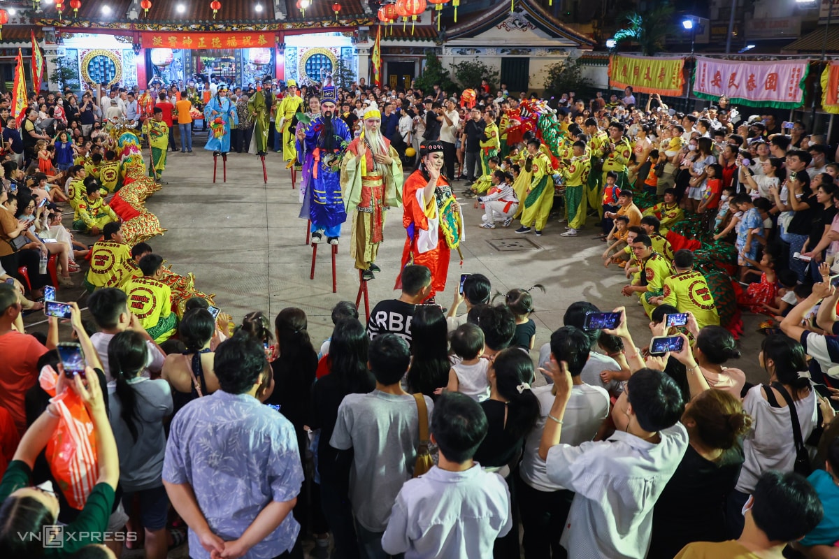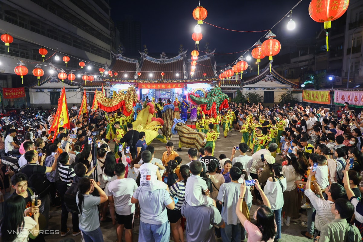 Người Hoa ở Chợ Lớn tổ chức Tết Trung thu tại Miếu Nhị Phủ, phường Chợ Lớn với nhiều hoạt động như múa lân rồng, bát tiên đi cà kheo, tối 6/10.