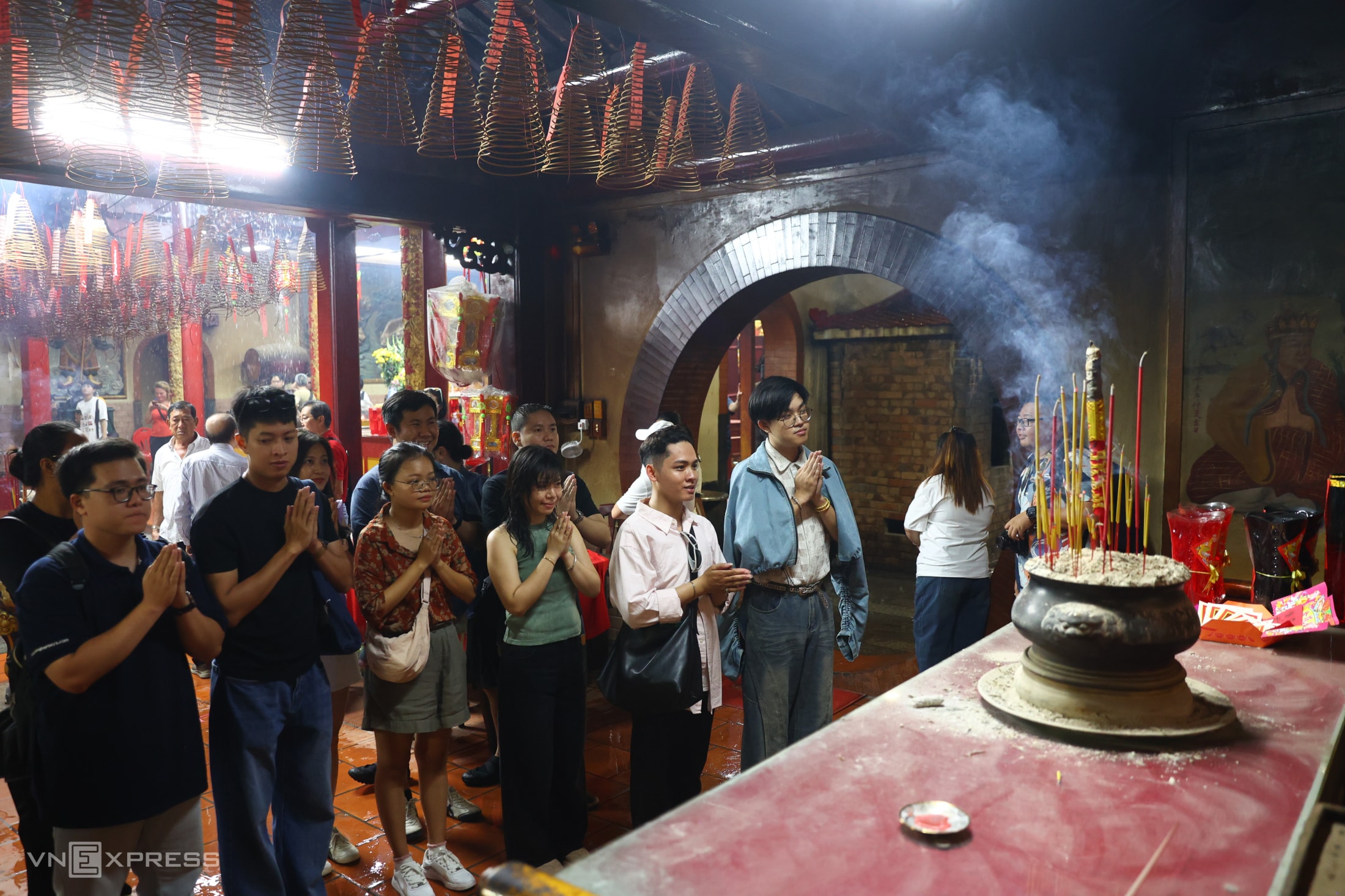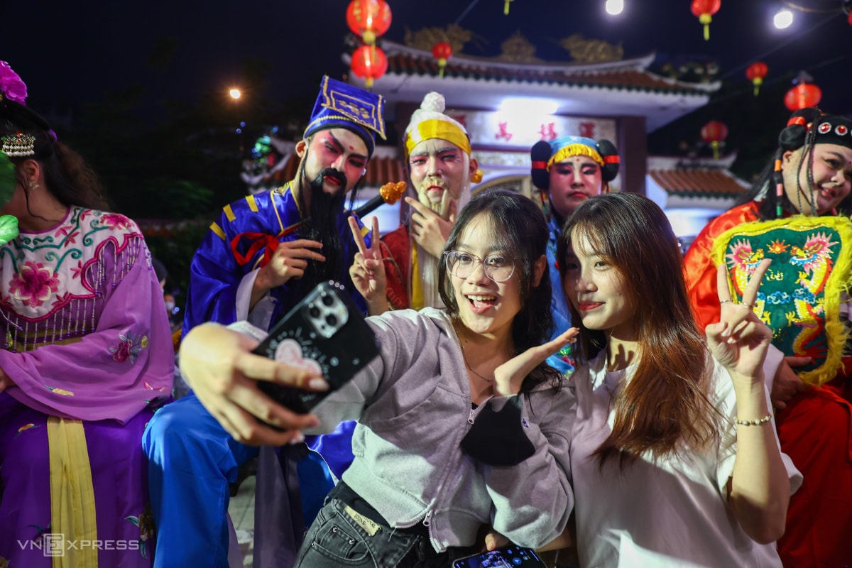 Hoài Thương, 19 tuổi, (cầm điện thoại) cùng bạn chụp hình với các vị Bát Tiên. Đây là lần đầu nữ sinh tới đây sau khi xem các video về lễ hội ở miếu Nhị Phủ trên mạng xã hội.