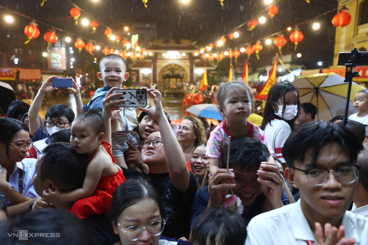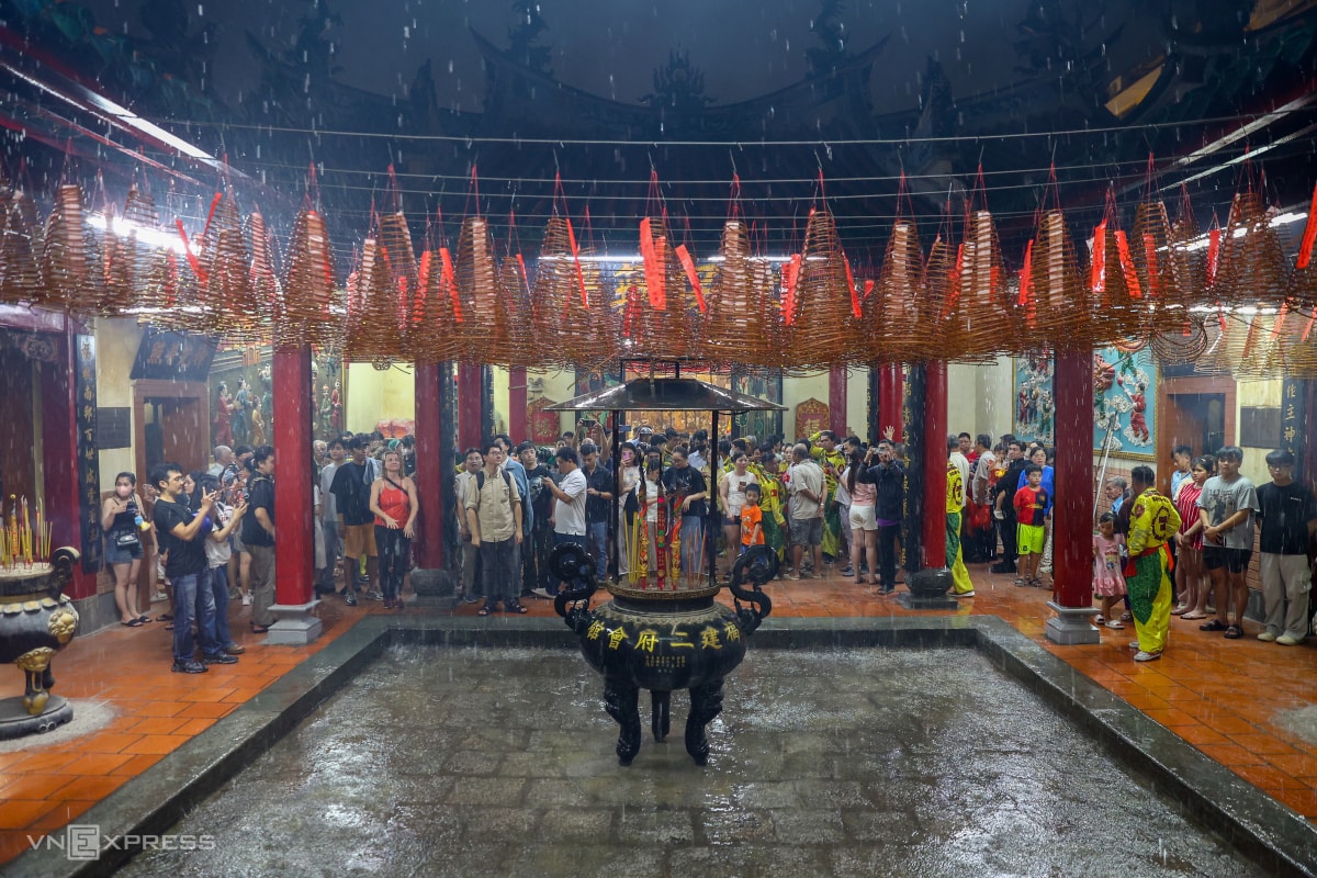 Mưa nặng hạt nhưng nhiều người vẫn đứng kín khoảng sân nhỏ trong chánh điện xem lân sư rồng và hành lễ tại các gian thờ.
