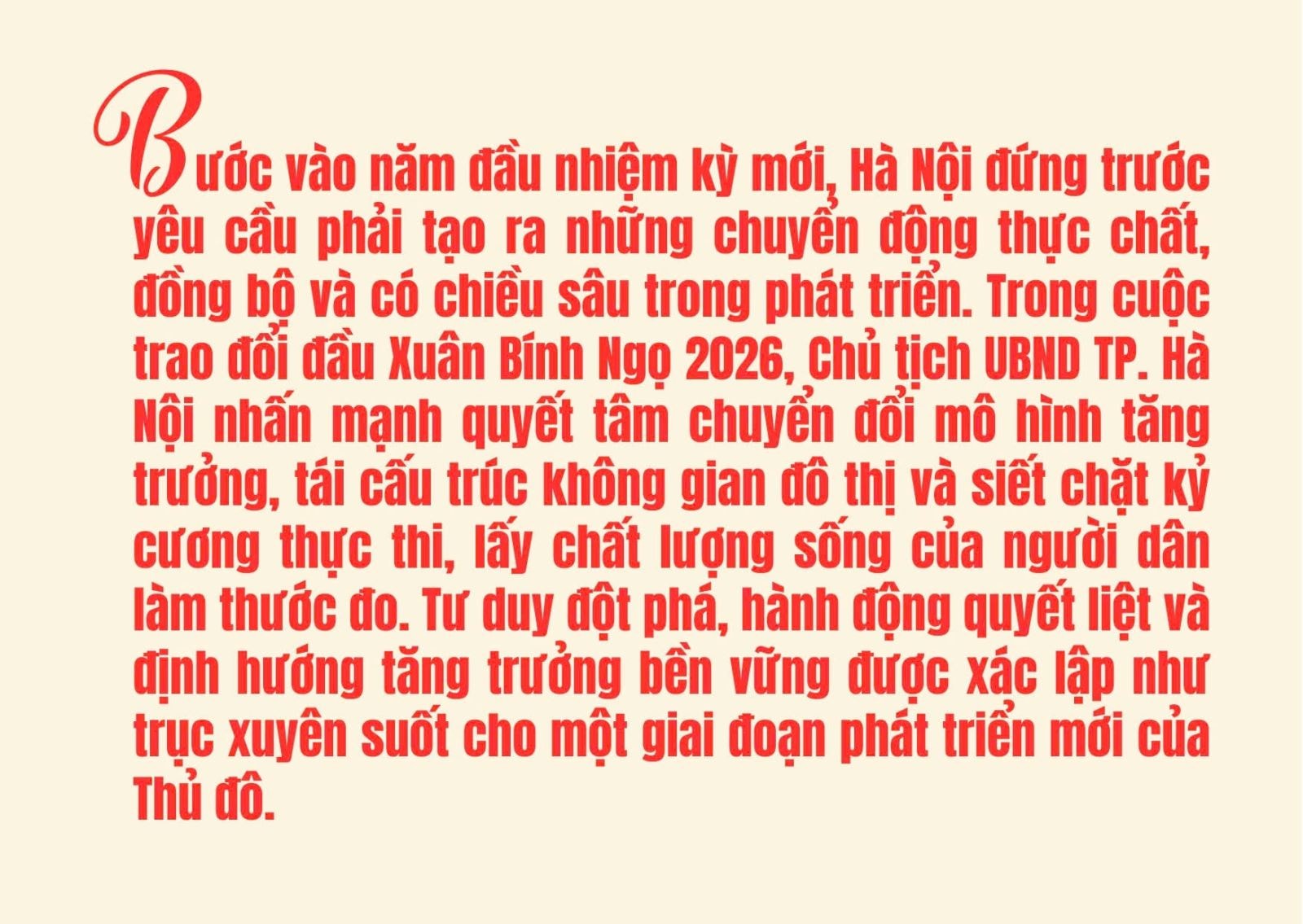 Năm 2026 là năm đầu tiên triển khai Nghị quyết Đại hội Đảng bộ thành phố lần thứ XVIII và Nghị quyết Đại hội Đảng toàn quốc lần thứ XIV. Chúng tôi xác định đây không chỉ là năm tăng tốc, mà còn năm xác lập mô hình tăng trưởng mới cho Thủ đô. Đó là chuyển mạnh từ tăng trưởng chủ yếu dựa vào vốn, lao động và đất đai sang tăng trưởng dựa trên năng suất, sáng tạo và bền vững.