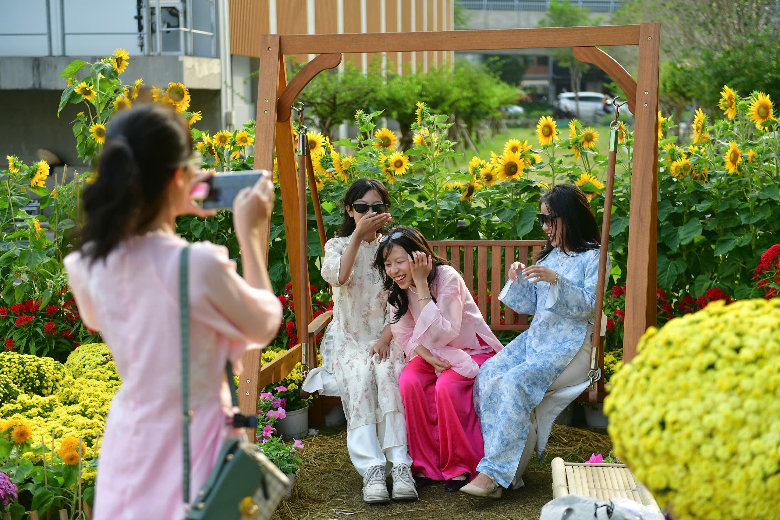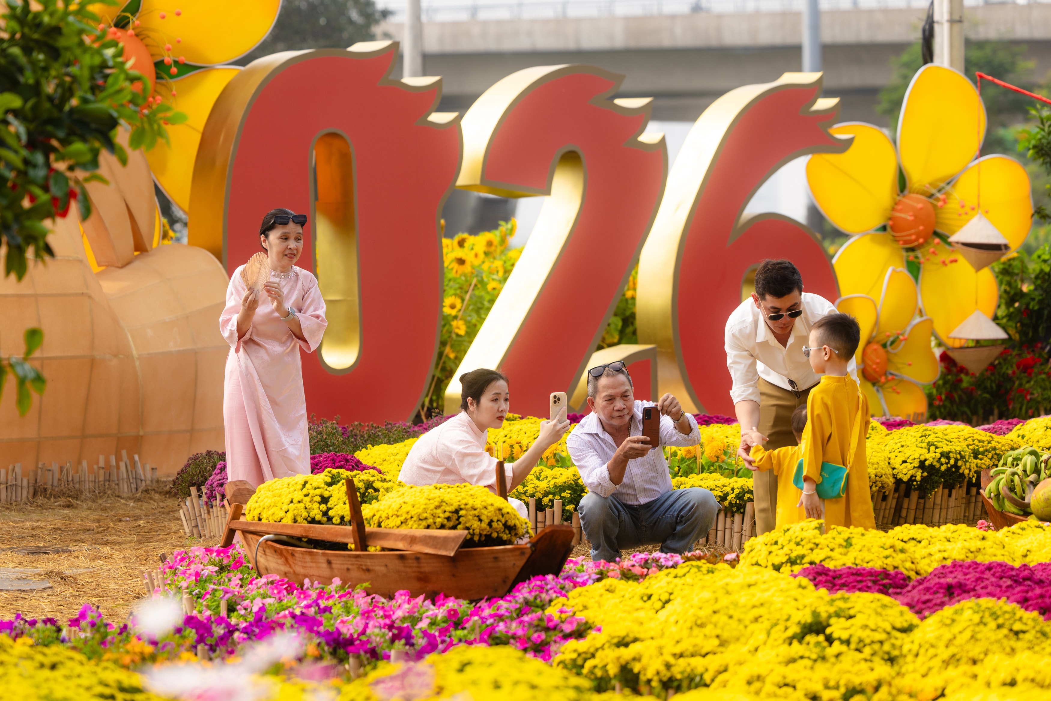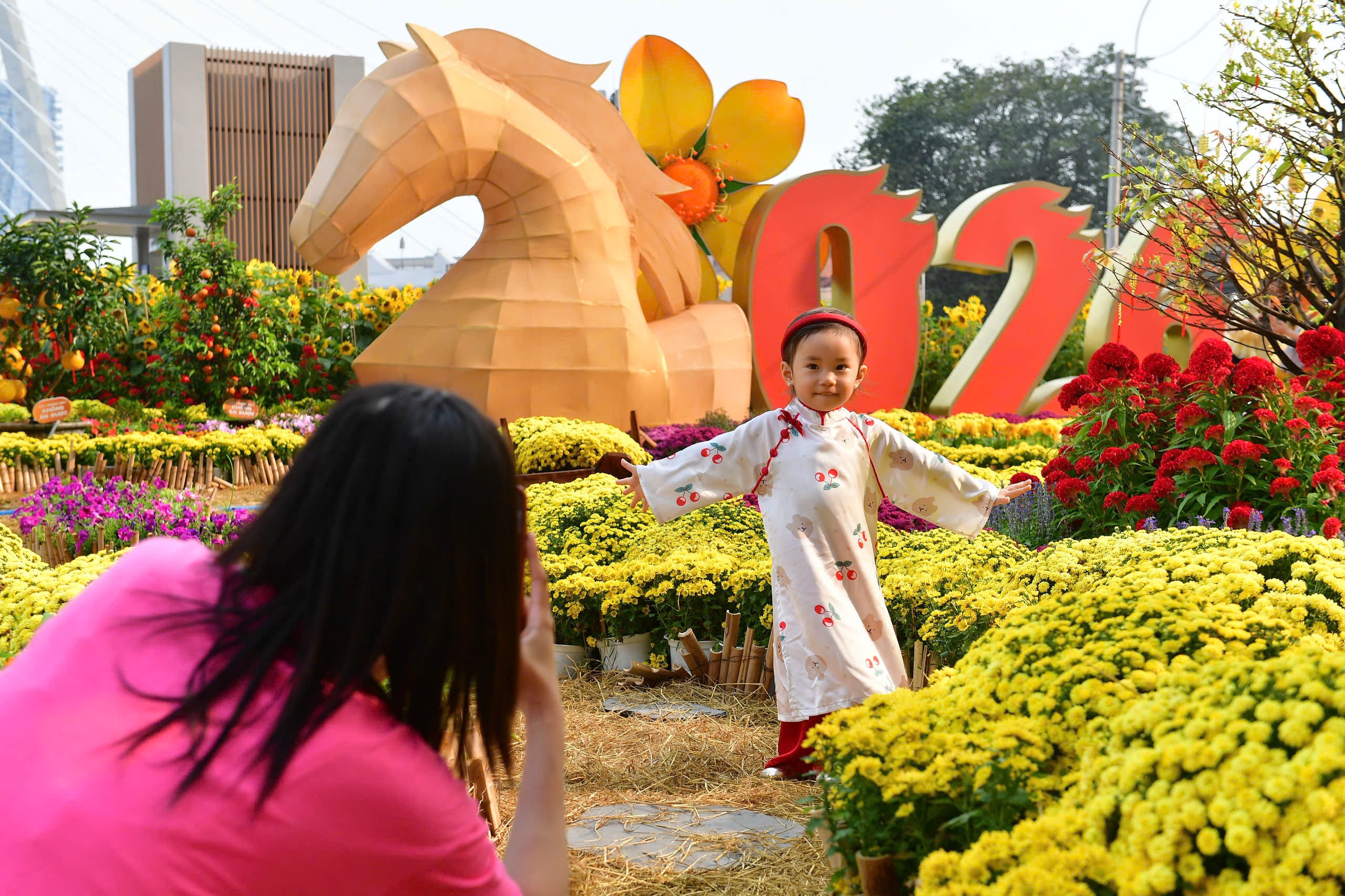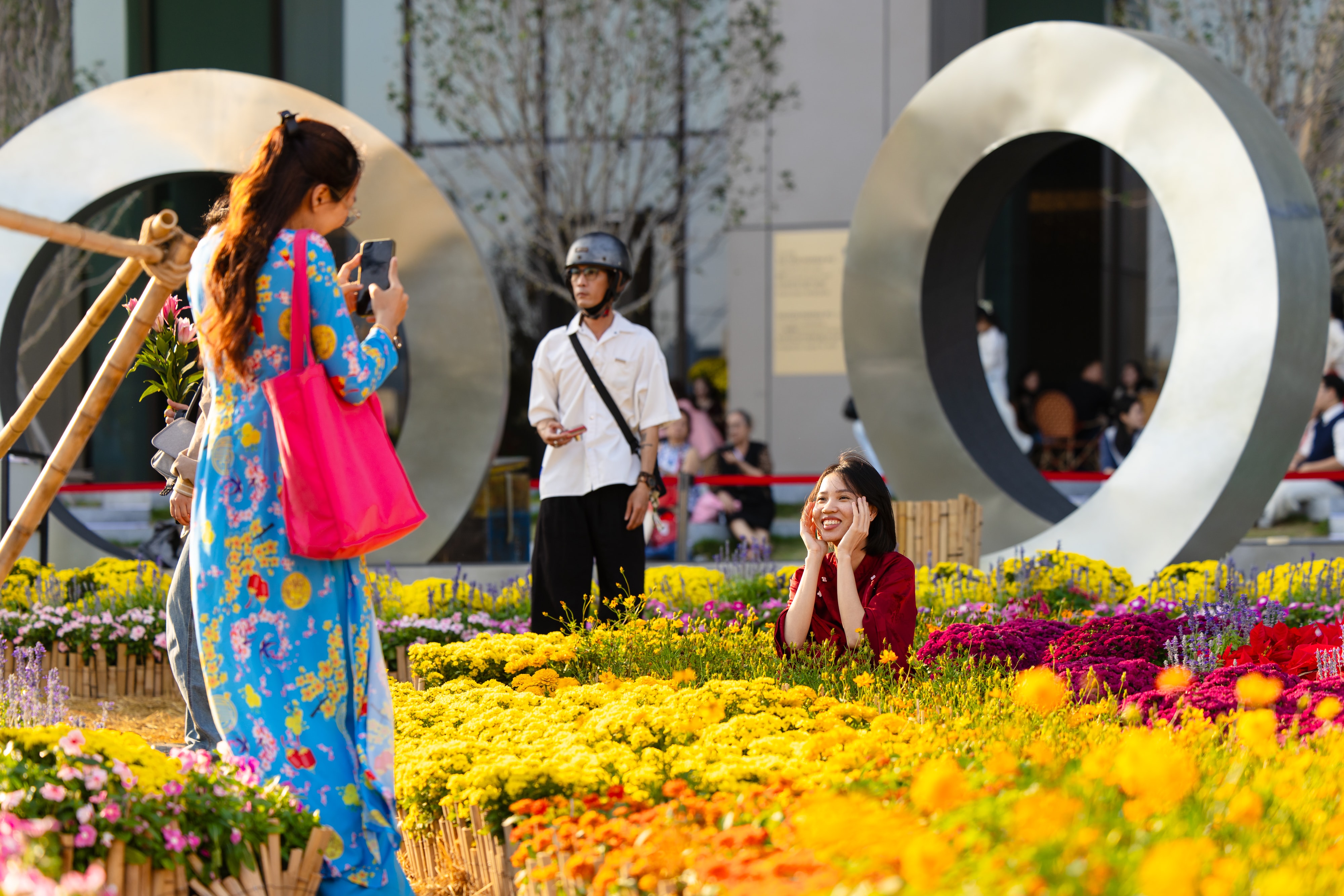 Trần Minh Châu, du học sinh từ Australia về nước, cùng gia đình đến chơi cho biết, về Việt Nam lúc nào cũng vui, không khí Tết ở đây rộn ràng và gần gũi. Châu nói thích nhất khu ngựa vàng vì vừa tượng trưng cho năm mới, vừa là góc ảnh đẹp khi chiều xuống. "Cả nhà em ở Mỹ, Australia cùng về, biết có vườn hoa bên sông nên ghé chụp ảnh kỷ niệm", Châu chia sẻ.
