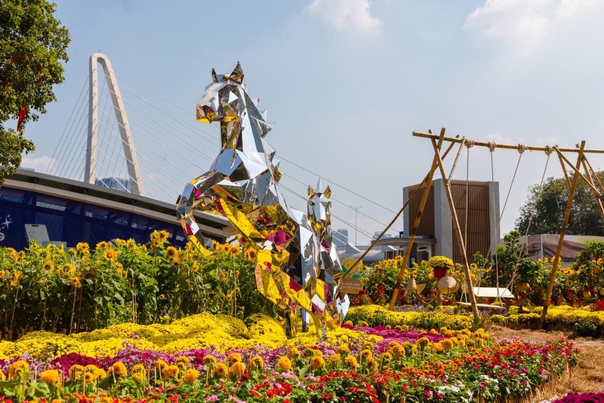 Công viên hoa Saigon Marina IFC trưng bày ba tạo hình linh vật ngựa dáng đứng và chất liệu khác nhau, phản ánh thay đổi Tết Việt ở từng giai đoạn phát triển.