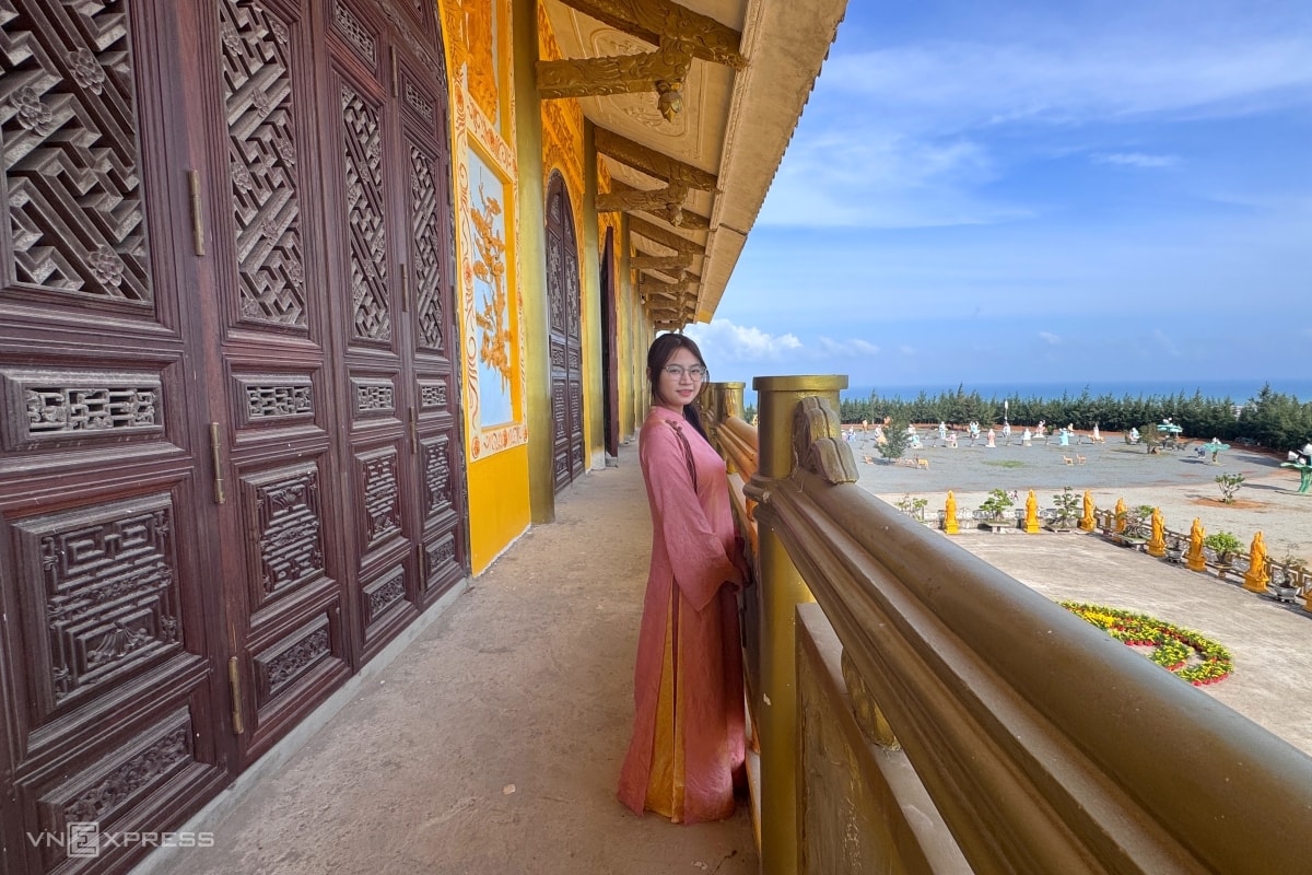 Hiền Vy, 26 tuổi, ở Quảng Ngãi mặc áo dài chụp hình lưu niệm ngày cận Tết ở chùa.