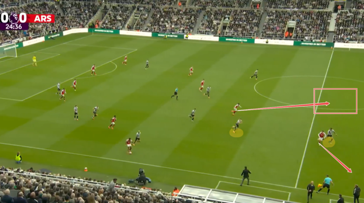 Những pha chạy chỗ đó giúp tạo ra các lỗ hổng nơi hàng thủ đối phương, trở thành khoảng trống cho các đồng đội khai thác. Lấy ví dụ trong trận làm khách trước Newcastle, khi Gyokeres di chuyển chéo từ nách phải trung lộ hướng ra biên, anh kéo một trong số hai trung vệ của chủ nhà là Malick Thiaw khỏi vị trí, mở ra khoảng trống lớn để các đồng đội tận dụng. Leandro Trossard đã suýt ghi bàn từ tình huống này khi dứt điểm trúng cột dọc.