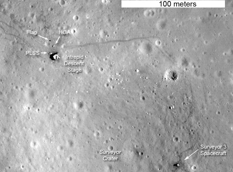 LRO cũng không quan sát được lá cờ đầu tiên mà phi hành đoàn Apollo 11 cắm trên Mặt Trăng. Camera bên trong khoang đổ bộ bắt đầu ghi hình sau khi tàu đã bay lên khỏi bề mặt thiên thể và lá cờ không xuất hiện trong video, nhưng Aldrin khẳng định ông thoáng thấy lá cờ bị đổ trong quá trình cất cánh. Trong những nhiệm vụ Apollo sau này, phi hành gia cắm cờ cách xa khoang đổ bộ hơn.