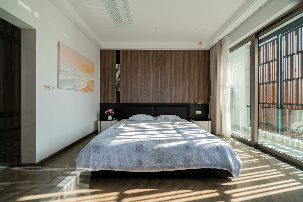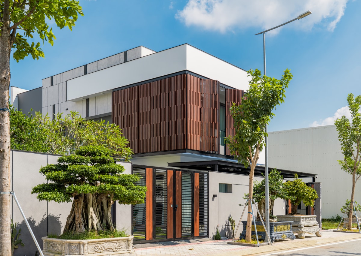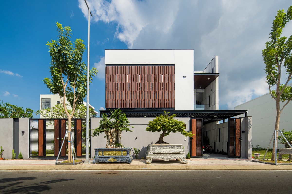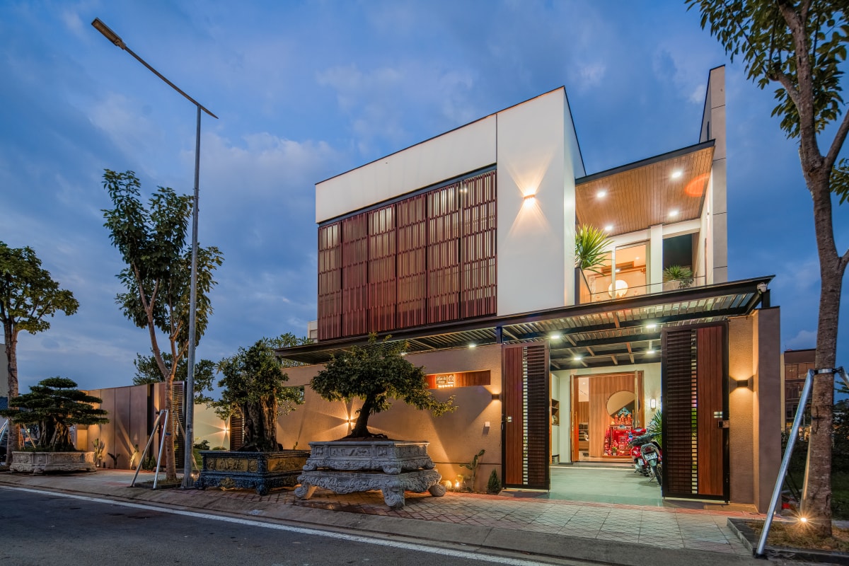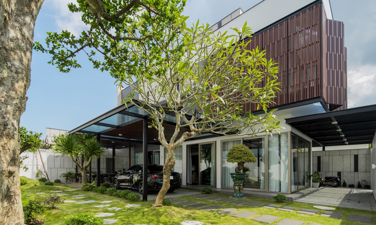 Căn nhà được tổ chức mặt bằng cân đối giữa khu ở và sân vườn, kết hợp hệ lam chắn nắng để cải thiện vi khí hậu hướng tây.