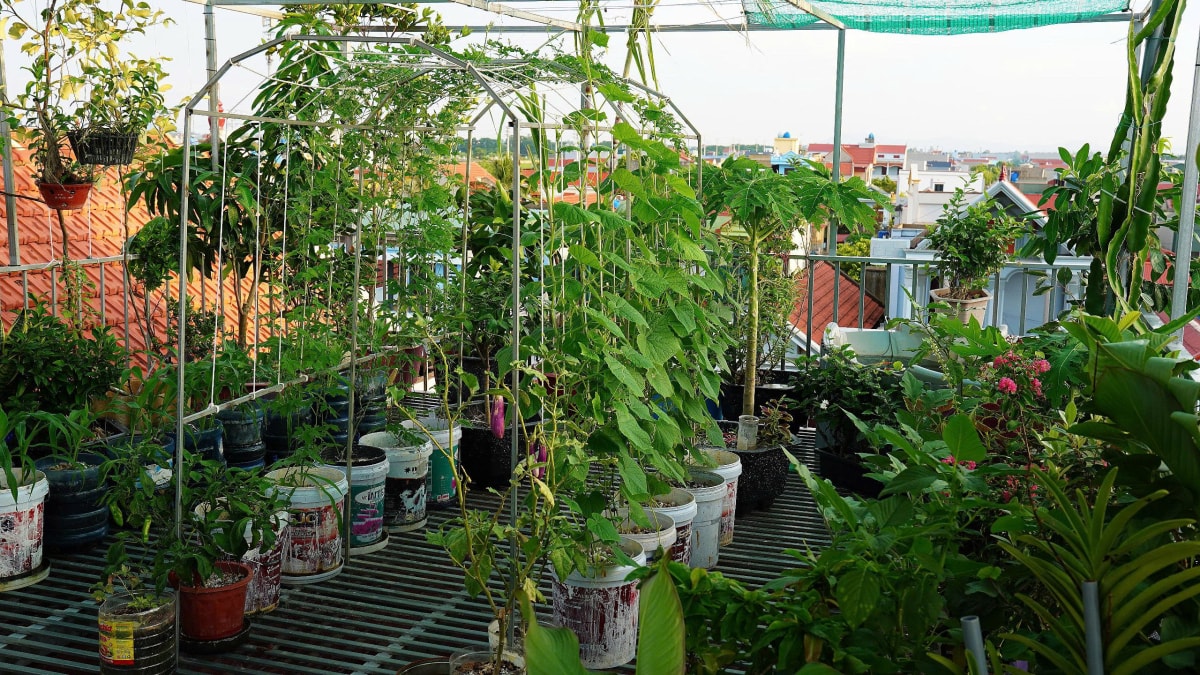 Khu vườn được cải tạo từ mái tôn. Anh Ngọc không đặt trực tiếp hệ thống trồng cây lên mái mà gia cố thêm hệ khung chịu lực riêng, dùng sắt hộp mạ kẽm dày 1.8mm làm cột chống và khung đỡ.