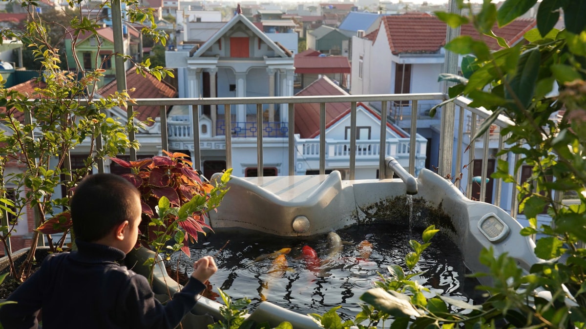 Trên ban công tầng 3 và sân thượng, anh Ngọc đặt hai hồ cá nhỏ tận dụng từ bể tắm cũ. Anh chủ yếu nuôi cá Koi và có kinh nghiệm nên việc chăm sóc khá dễ dàng.