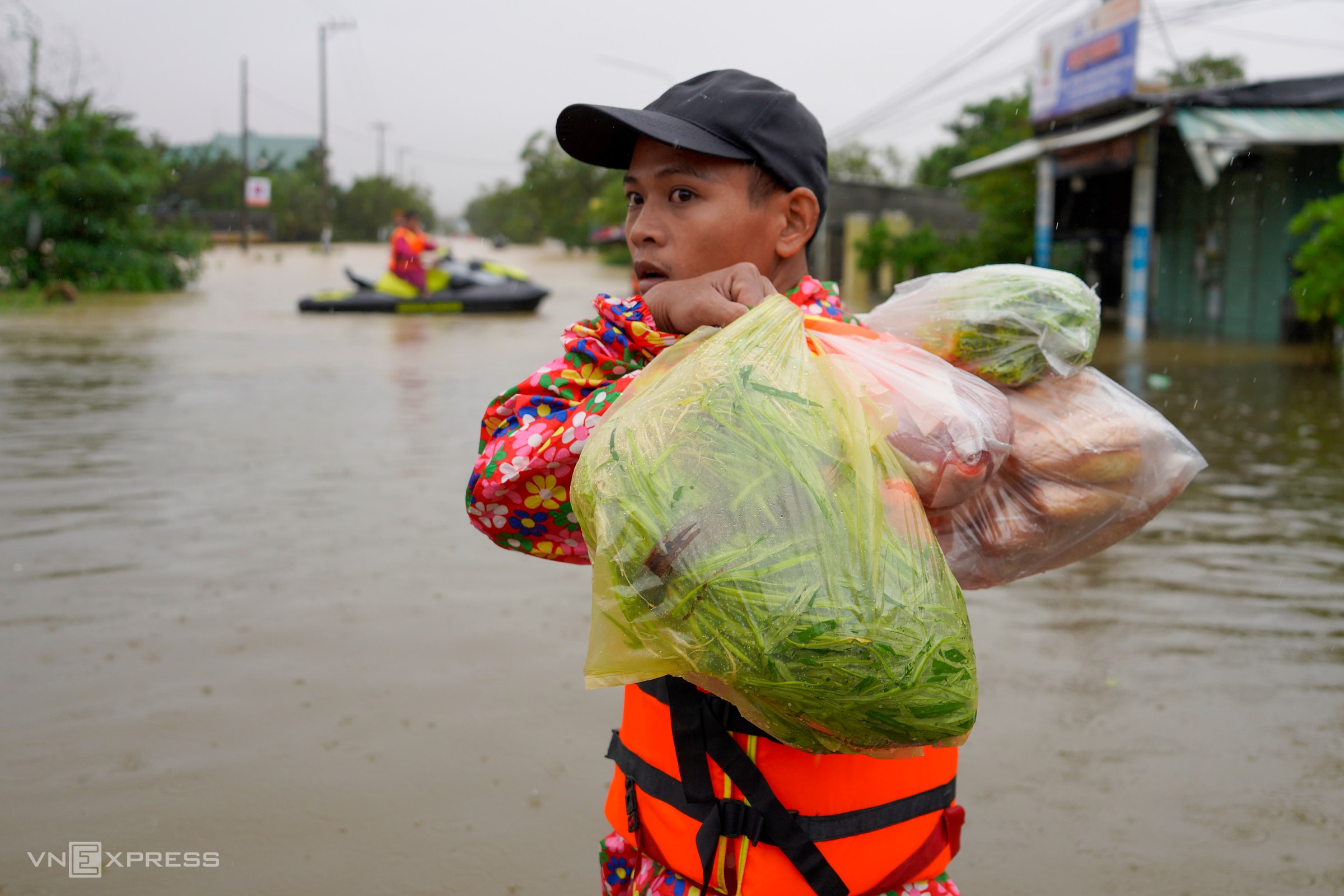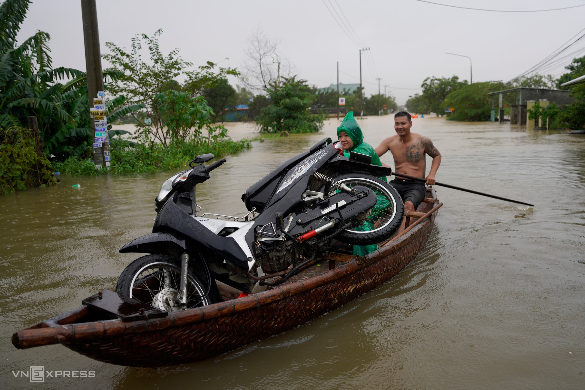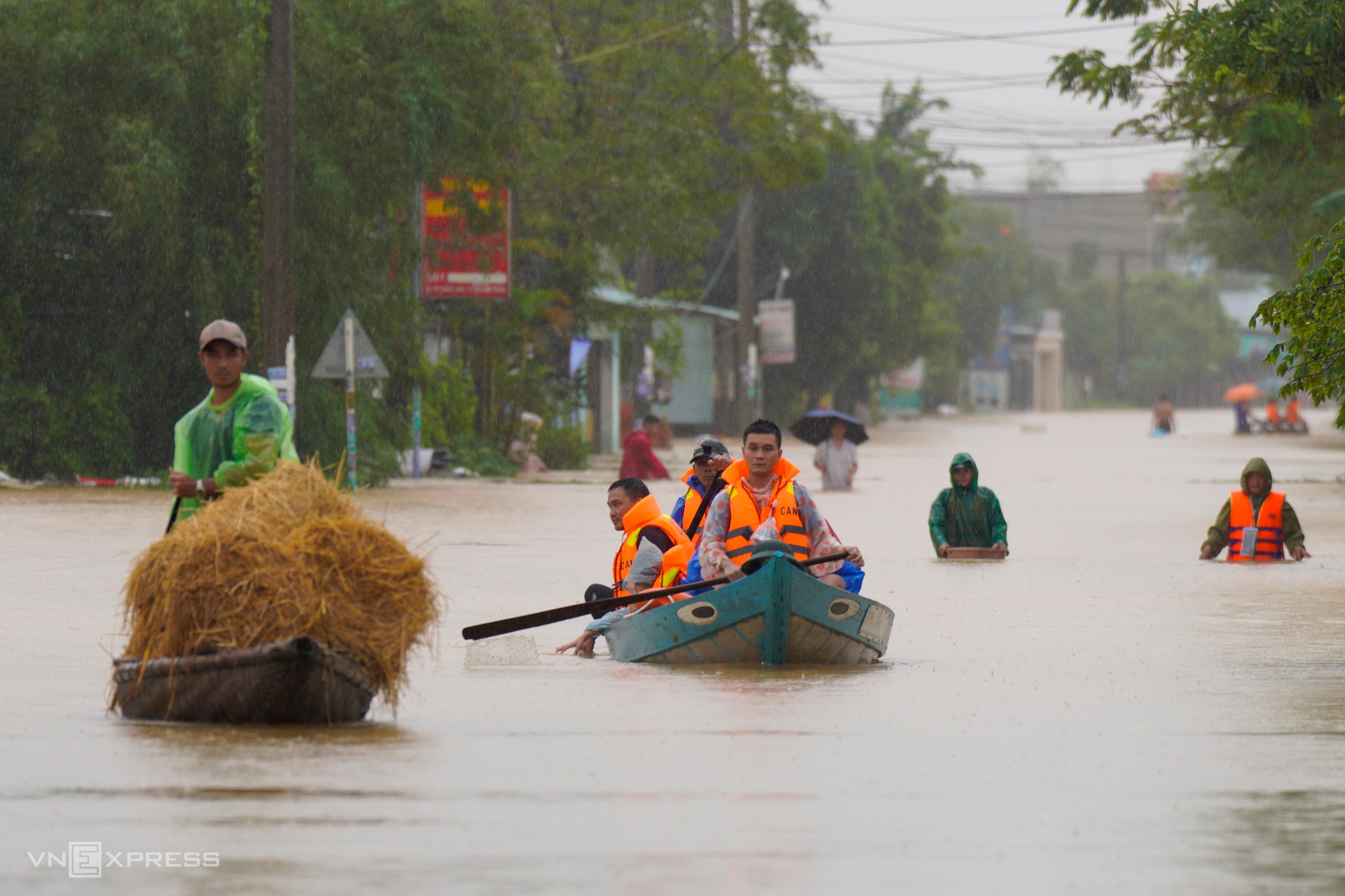 Ngay đầu tuyến DH8 giao đường Trần Thủ Độ, nước ngập gần một mét, người dân phường Điện Bàn Đông phải dùng thuyền đi lại, trong đó nhiều người chọn cách lội bộ để ra khu vực bên ngoài lánh tạm hoặc mua lương thực, thực phẩm.