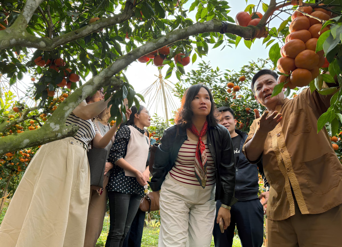 Khách đến tham quan vườn cam Canh ghép trên gốc cây bưởi của ông Dũng thường không tin là thật, tưởng quả được gắn keo vì "chi chít như chùm nho".