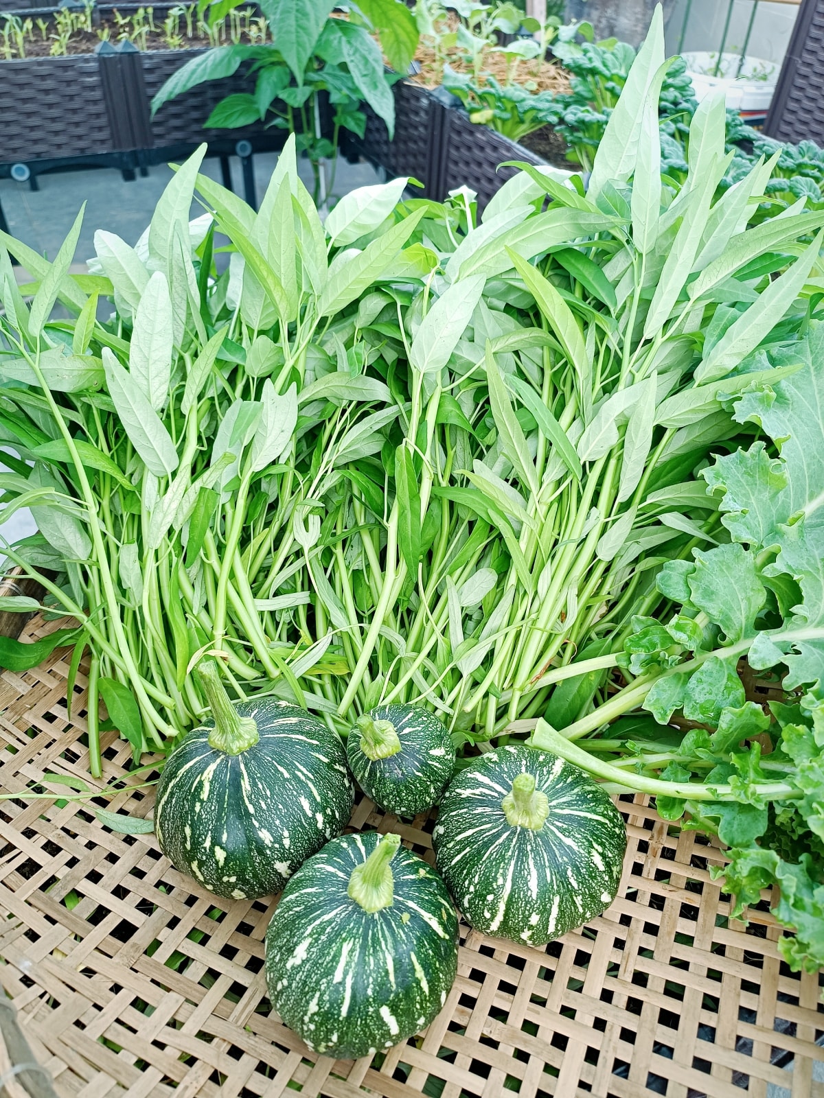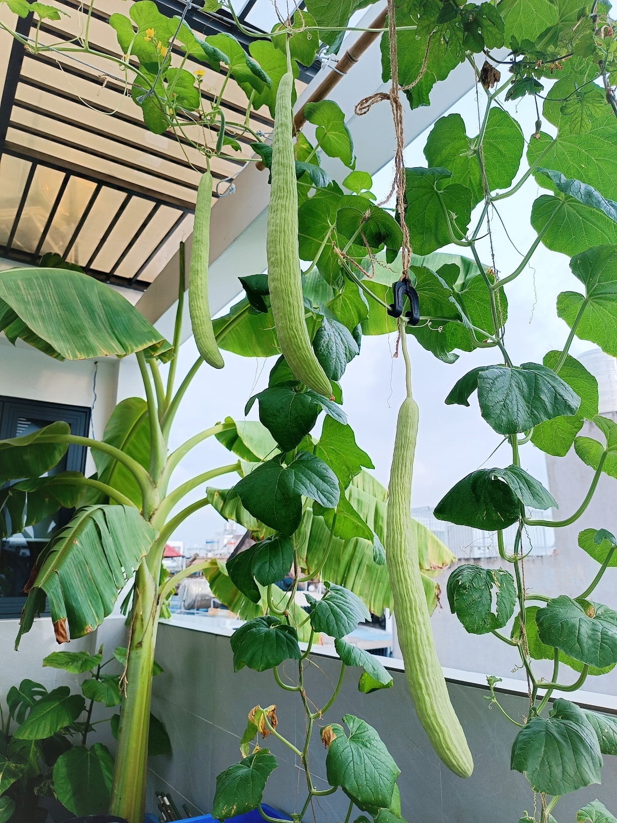 Trên sân thượng 36 m2, anh Trần Minh Phúc, 42 tuổi, trồng dưa chuột rắn, khổ qua trái tim, bí vua Hàn Quốc để các con khám phá tự nhiên.