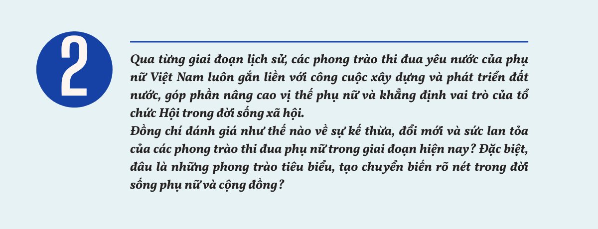 Cùng với phong trào thi đua, các chương trình có ý nghĩa nhân văn sâu sắc như “Đồng hành cùng Phụ nữ biên cương”, “Mẹ đỡ đầu”, hỗ trợ “Phụ nữ khởi nghiệp”… đã lan tỏa mạnh mẽ, thể hiện tinh thần nhân ái và trách nhiệm xã hội của Phụ nữ Việt Nam, nội dung gắn với yêu cầu của thời đại mới như phát triển kinh tế xanh, chuyển đổi số, bảo vệ môi trường, xây dựng gia đình hạnh phúc, văn minh và hội nhập quốc tế.