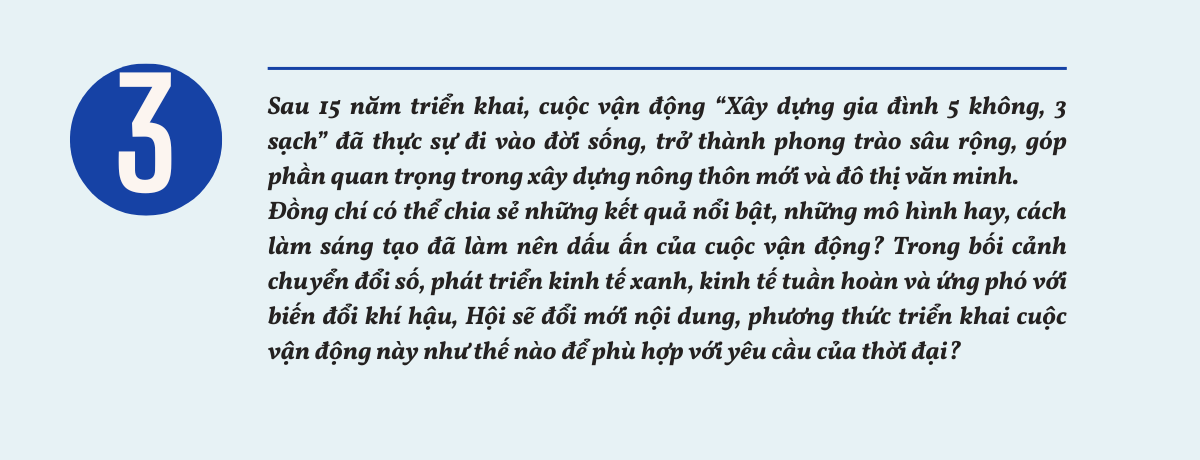 15 năm không chỉ là dấu mốc của một cuộc vận động, mà còn là hành trình vun đắp những giá trị tốt đẹp, nơi hàng triệu phụ nữ Việt Nam cùng nhau viết nên câu chuyện của tình yêu thương, của trách nhiệm và niềm tin vào cuộc sống. Cuộc vận động “Xây dựng gia đình 5 không, 3 sạch”, góp phần kiến tạo những ngôi nhà sạch đẹp, những làng quê trù phú, xây nên “ngôi nhà tinh thần” của người phụ nữ Việt Nam thời đại mới, nơi hội tụ tình yêu thương, trách nhiệm và khát vọng cống hiến.
