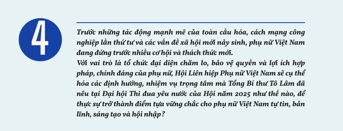 Trước những biến động sâu rộng của thời đại toàn cầu hóa và cách mạng công nghiệp lần thứ tư, phụ nữ Việt Nam không chỉ cần bản lĩnh để thích ứng mà còn cần được đồng hành, hỗ trợ để phát huy tiềm năng và khẳng định vị thế trong mọi lĩnh vực của đời sống xã hội. Với vai trò là tổ chức đại diện cho phụ nữ cả nước, Hội LHPN Việt Nam sẽ tiếp tục cụ thể hóa các định hướng, nhiệm vụ trọng tâm mà Tổng Bí thư Tô Lâm đã nêu tại Đại hội Thi đua yêu nước năm 2025; đồng thời, chú trọng xây dựng tổ chức vững mạnh, hiện đại, gần gũi và đồng hành cùng phụ nữ trong từng giai đoạn cuộc sống, để mỗi hội viên đều cảm nhận được sự hỗ trợ thực chất và truyền cảm hứng. Qua đó, Hội sẽ thực sự trở thành điểm tựa tin cậy, giúp phụ nữ Việt Nam tự tin, bản lĩnh, sáng tạo và hội nhập vững vàng trong kỷ nguyên mới.