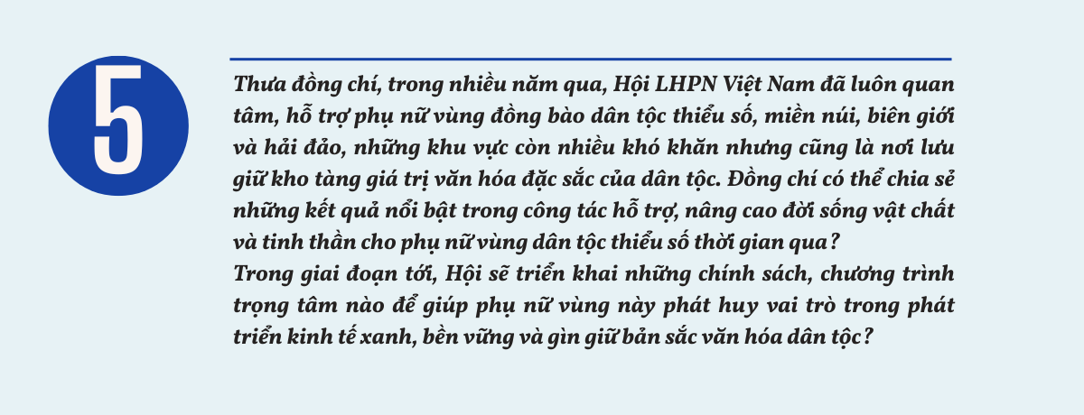 Trong những năm qua, các cấp Hội LHPN Việt Nam đã triển khai nhiều giải pháp mang tính hệ thống nhằm nâng cao đời sống vật chất, tinh thần cho phụ nữ vùng dân tộc thiểu số. Nhiều chương trình, dự án, đề án mang lại những hỗ trợ thiết thực cho phụ nữ vùng dân tộc thiểu số được triển khai như: Dự án 8 “Thúc đẩy bình đẳng giới và giải quyết những vấn đề cấp thiết với phụ nữ và trẻ em” thuộc Chương trình Mục tiêu quốc gia phát triển kinh tế xã hội vùng đồng bào dân tộc thiểu số và miền núi (DTTS&MN), Chương trình “Đồng hành cùng phụ nữ biên cương”… đạt được nhiều kết quả nổi bật.