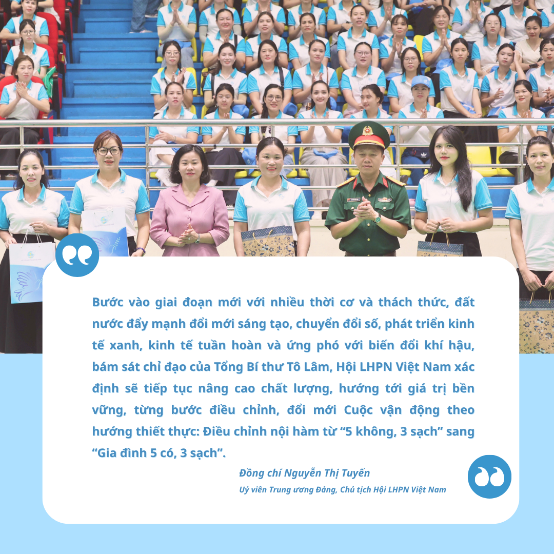 Bước vào giai đoạn mới với nhiều thời cơ và thách thức, đất nước đẩy mạnh đổi mới sáng tạo, chuyển đổi số, phát triển kinh tế xanh, kinh tế tuần hoàn và ứng phó với biến đổi khí hậu, bám sát chỉ đạo của Tổng Bí thư Tô Lâm, Hội LHPN Việt Nam xác định sẽ tiếp tục nâng cao chất lượng, hướng tới giá trị bền vững, từng bước điều chỉnh, đổi mới Cuộc vận động theo hướng thiết thực: Điều chỉnh nội hàm từ “5 không, 3 sạch” sang “Gia đình 5 có, 3 sạch”, trong đó tập trung thực hiện các tiêu chí có ngôi nhà an toàn, có sinh kế bền vững, có sức khỏe, có kiến thức và có nếp sống văn hóa; sạch nhà, sạch bếp và sạch ngõ, góp phần nâng cao chất lượng cuộc sống gia đình Việt Nam đảm bảo “3 an” (an toàn - an tâm - an sinh) phù hợp với yêu cầu phát triển mới của nông thôn Việt Nam.