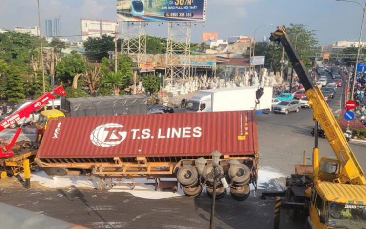 Khoảng 3h, nam tài xế hơn 40 tuổi điều khiển xe đầu kéo kéo theo container 40 feet, tải trọng khoảng 28 tấn, chạy trên đường Đỗ Mười, hướng từ cầu vượt Sóng Thần về vòng xoay An Sương. Khi ôm cua tại vòng xoay dưới dạ cầu Bình Phước, phương tiện bất ngờ mất thăng bằng, lật nghiêng sang một bên.
