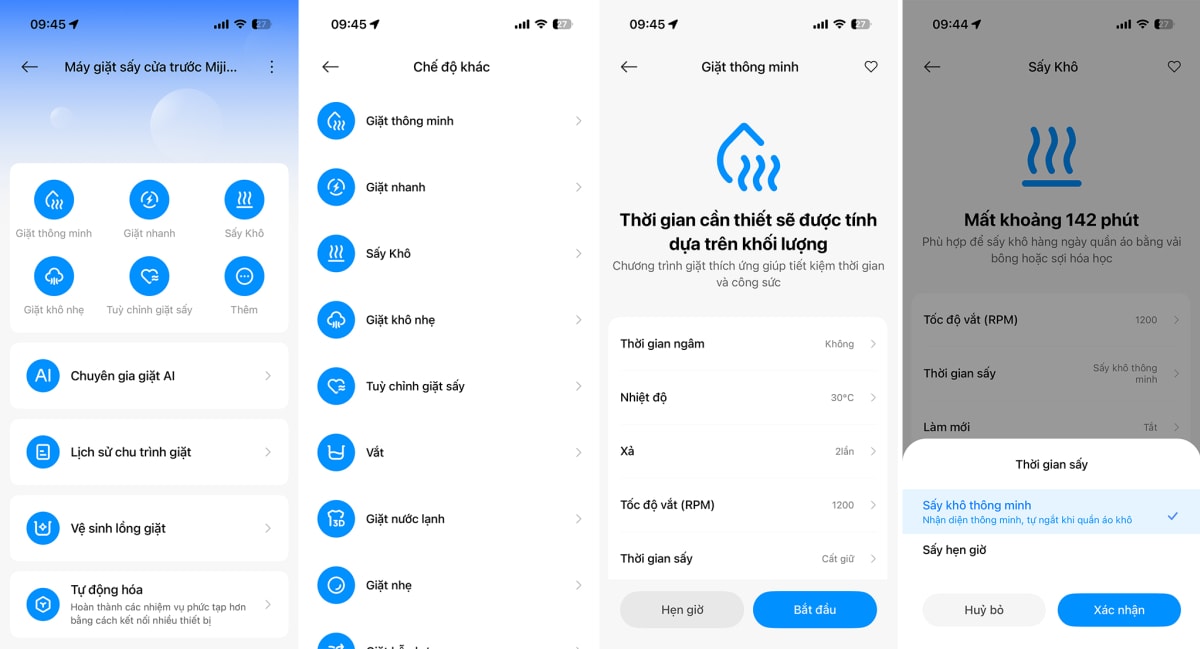 So với ứng dụng của thương hiệu đối thủ, hệ thống menu cài đặt, điều khiển của Xiaomi đơn giản và dễ hiểu hơn. Ngoài chu trình tự động hoàn toàn, người dùng có thể chọn hàng chục chế độ giặt khác nhau. Mỗi chế độ có thể chọn thông số chi tiết về số lần vắt, tốc độ vòng xoay, nhiệt độ nước giặt hay thời gian ngâm với quần áo bẩn nhiều. Ở chế độ sấy, tính năng sấy khô thông minh cho thấy sự tin cậy khi máy thực sự cân chỉnh thời gian sấy chính xác với độ ẩm quần áo. Tuy nhiên, người dùng cần nhớ cho lượng quần áo tối đa chỉ 7,5 kg nếu muốn cả giặt và sấy.