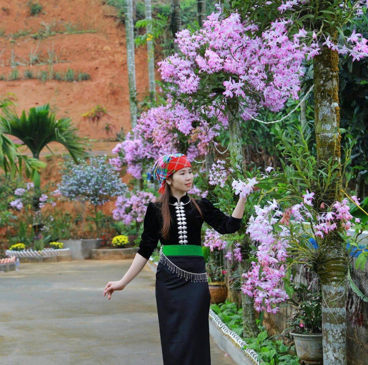 Chị Hà Thị Hoài Thu (ảnh), ở Nghĩa Lộ đến tham quan, chụp hình ở khu vườn hôm 21/3 cho biết: "Hoa lan đồng loạt nở trên thân cau, trong không khí mát lành ở xóm núi tạo cảm giác như lạc vào miền cổ tích".
