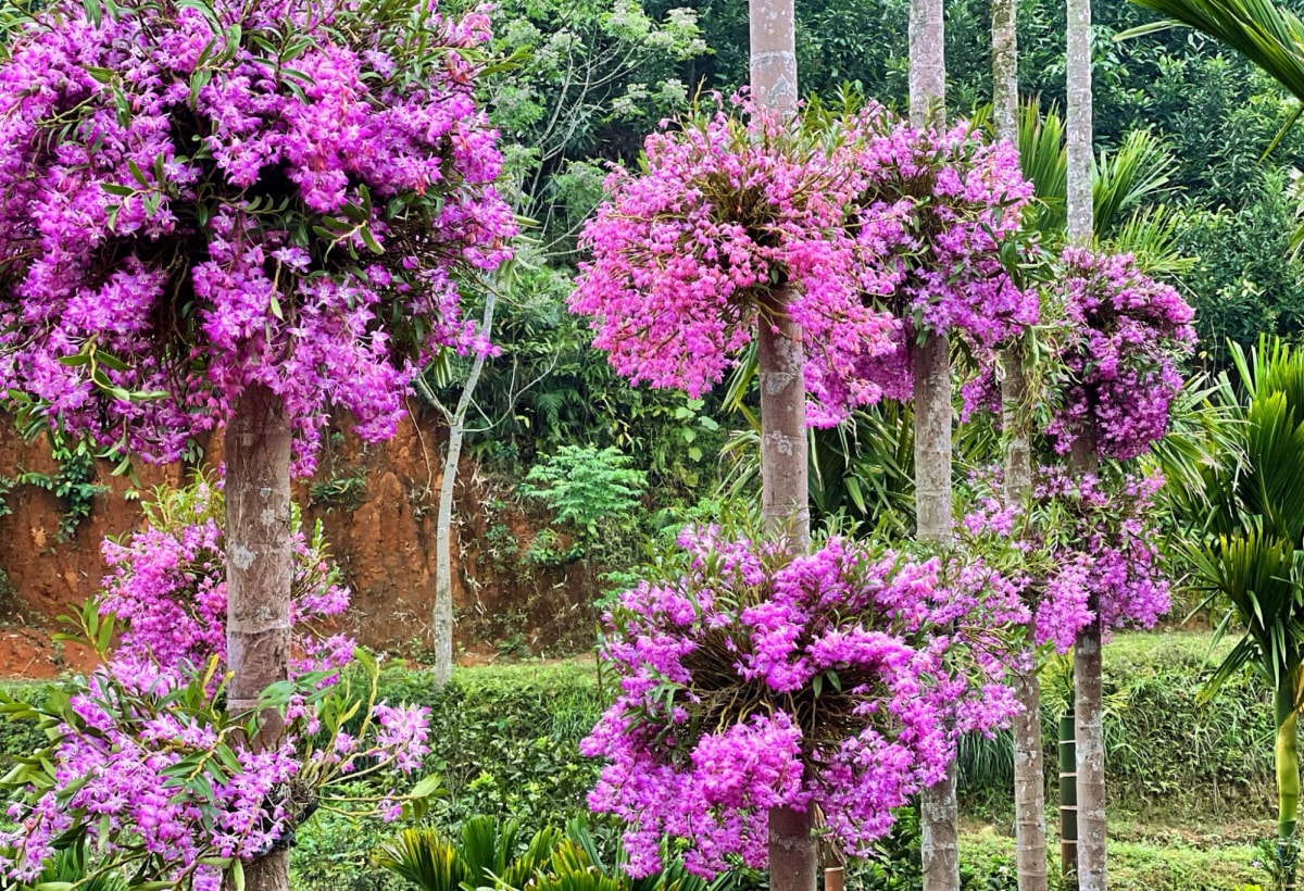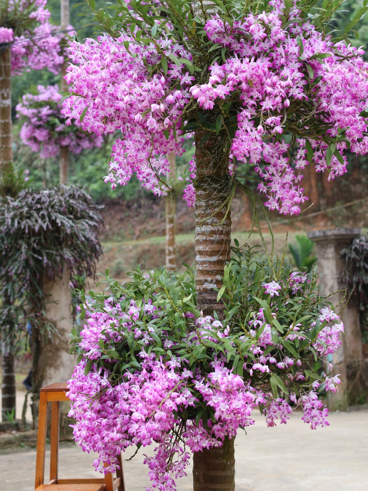 Một tuần nay, xóm Thanh Tú, xã Chấn Thịnh, tỉnh Lào Cai (Yên Bái cũ) trở nên náo nhiệt vì khách thập phương đến tham quan hoa lan nở. Giữa núi đồi, những giò phong lan đùi gà bung nở tím trên thân cây cau, tạo nên khung cảnh như cổ tích.