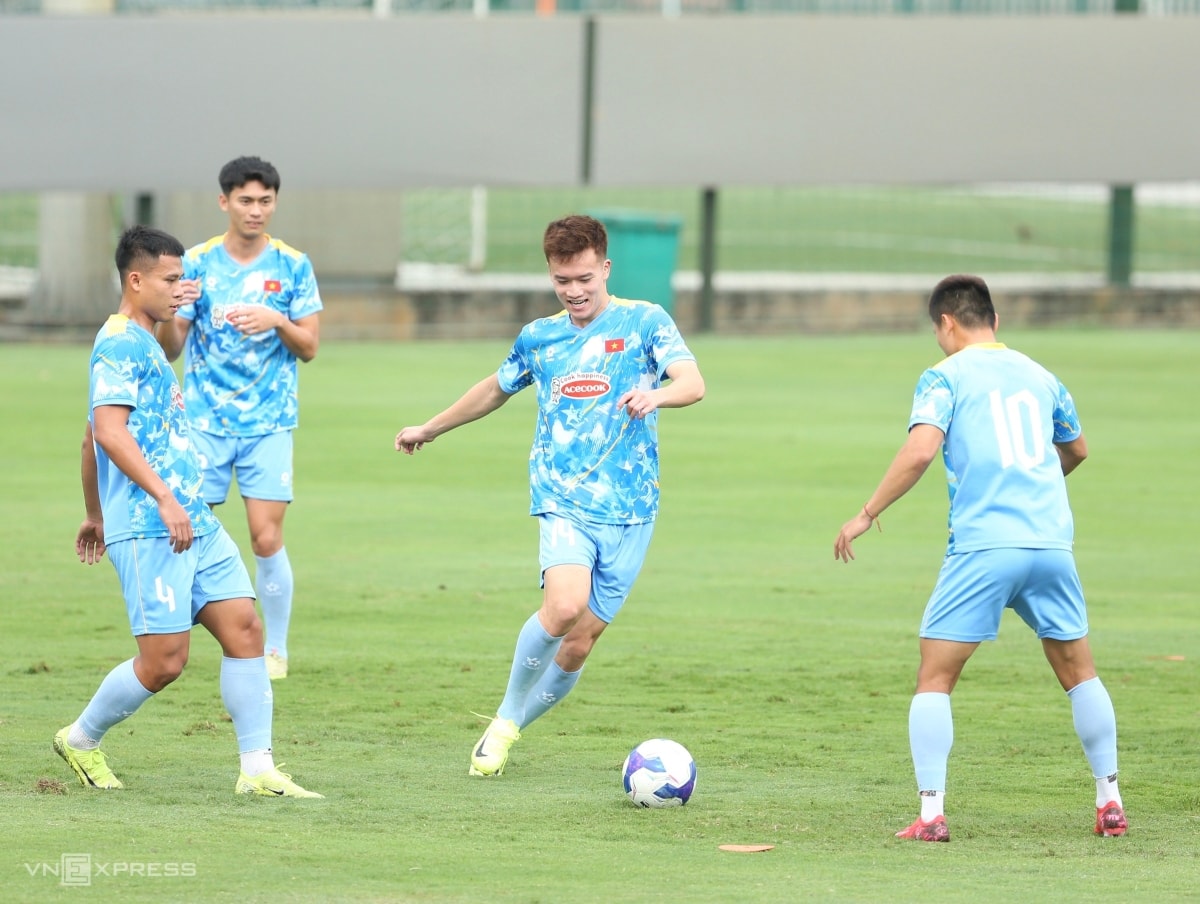 Ngoài Xuân Son phải tập riêng, quân số tập luyện của đội hôm nay là 15 người, với sự góp mặt của nhóm cầu thủ Ninh Bình gồm Phạm Gia Hưng (ảnh trái), Đặng Văn Lâm (giữa), Nguyễn Hoàng Đức, Lê Ngọc Bảo (phải) và Trương Tiến Anh, cùng Khuất Văn Khang của Thể Công.