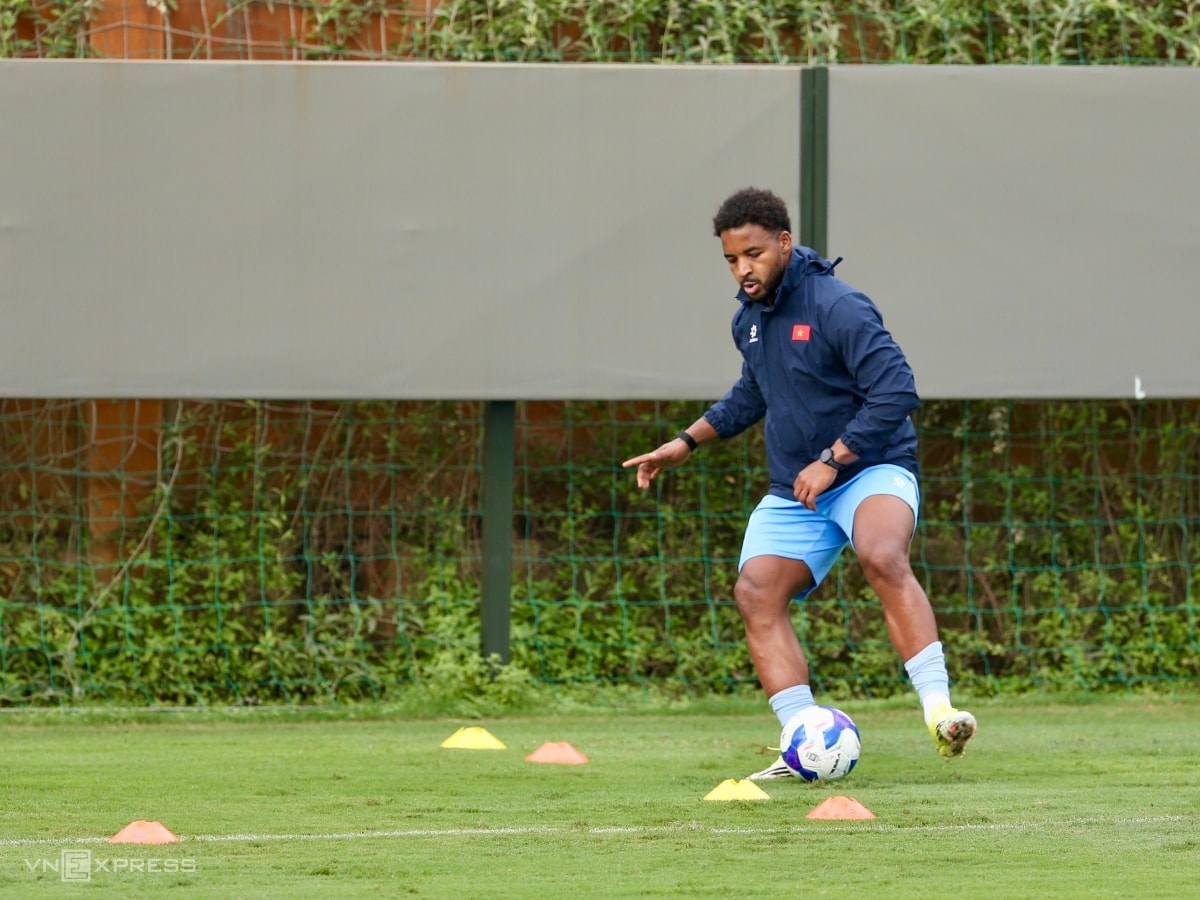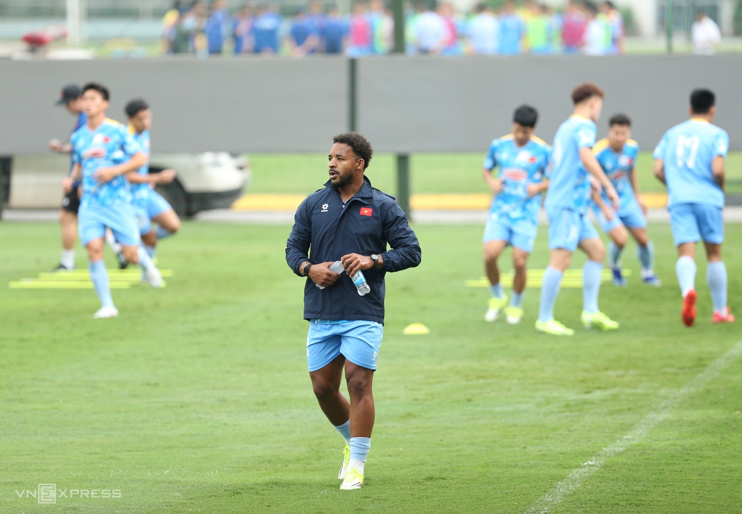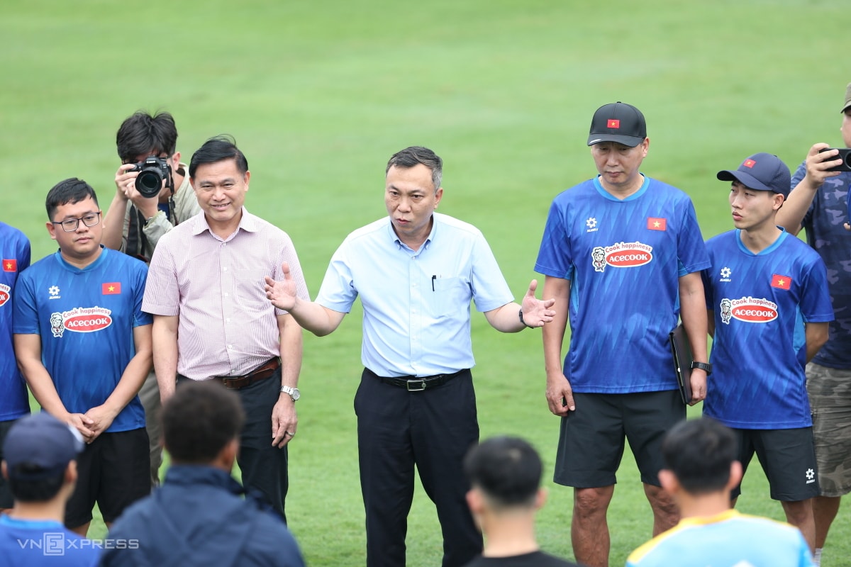 Trước buổi tập chiều nay, đội tuyển cũng đón tiếp Chủ tịch LĐBĐ Việt Nam (VFF) Trần Quốc Tuấn (giữa) và Phó Chủ tịch Trần Anh Tú (thứ hai từ trái sang). Ông Tuấn cho rằng việc có thêm những cầu thủ nhập tịch như Xuân Son và Đỗ Hoàng Hên sẽ góp phần tăng cường sức mạnh đội tuyển, đồng thời tạo nên sự kế thừa hiệu quả giữa các thế hệ, hướng tới mục tiêu duy trì vị thế tại khu vực Đông Nam Á và cải thiện thành tích ở đấu trường châu Á.