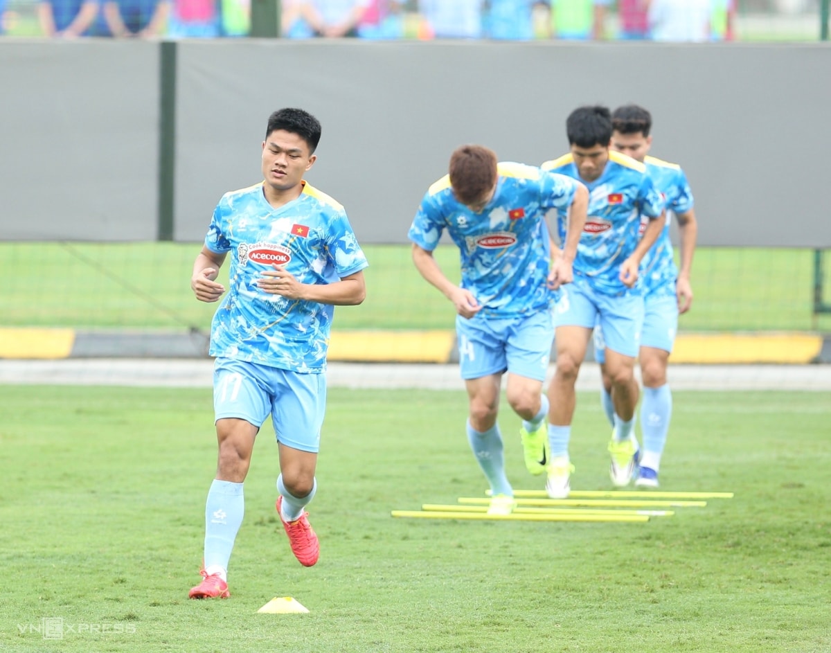 Sau khi chạy bộ hai vòng sân, Xuân Son chuyển sang tập với bóng, các bài di chuyển tiến và giật lùi được chia làm nhiều hiệp.