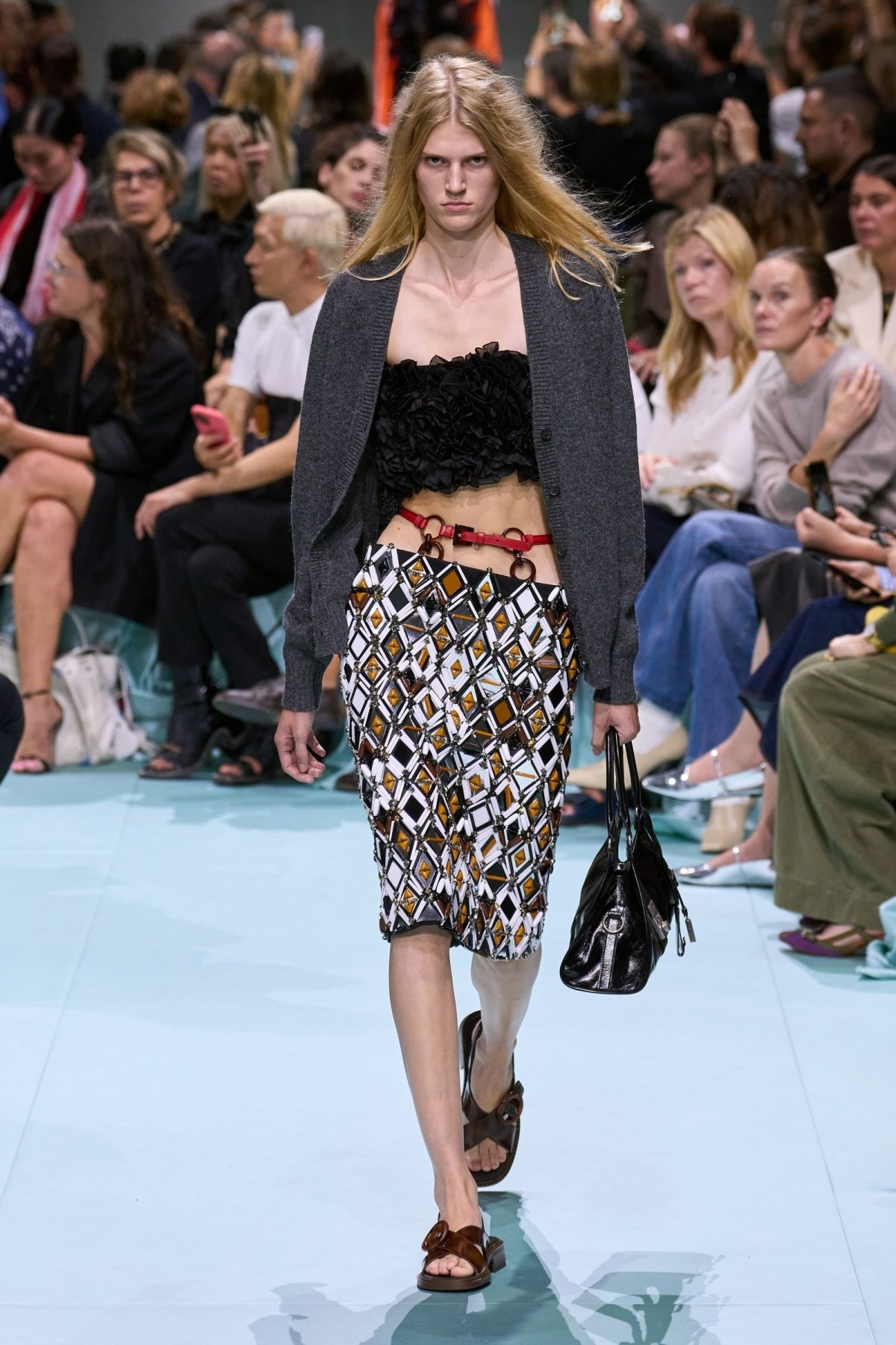 Trong làng mốt, phong cách thời trang Y2K được lấy cảm hứng từ giữa những năm 1990 và đầu những năm 2000 khi internet trở nên phổ biến hơn. Kiểu mặc này pha trộn giữa cái mới và cũ, chịu ảnh hưởng từ bước tiến công nghệ. Chất liệu sáng bóng, họa tiết cánh bướm, quần cạp trễ, crop top, cardigan, váy xếp ly, túi baguette, kính râm nhiều màu sắc, crop top, dép sục gót thấp, giày thể thao chunky là đặc trưng của Y2K. Ảnh: Gorunway
