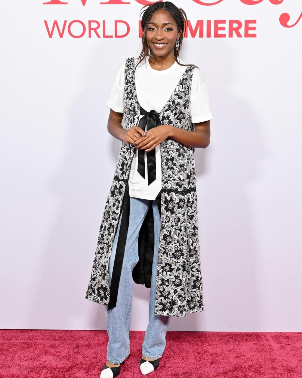 Trên thảm đỏ, phong cách này là lựa chọn của diễn viên Ayo Edebiri, thể hiện qua mốt váy trùm quần.