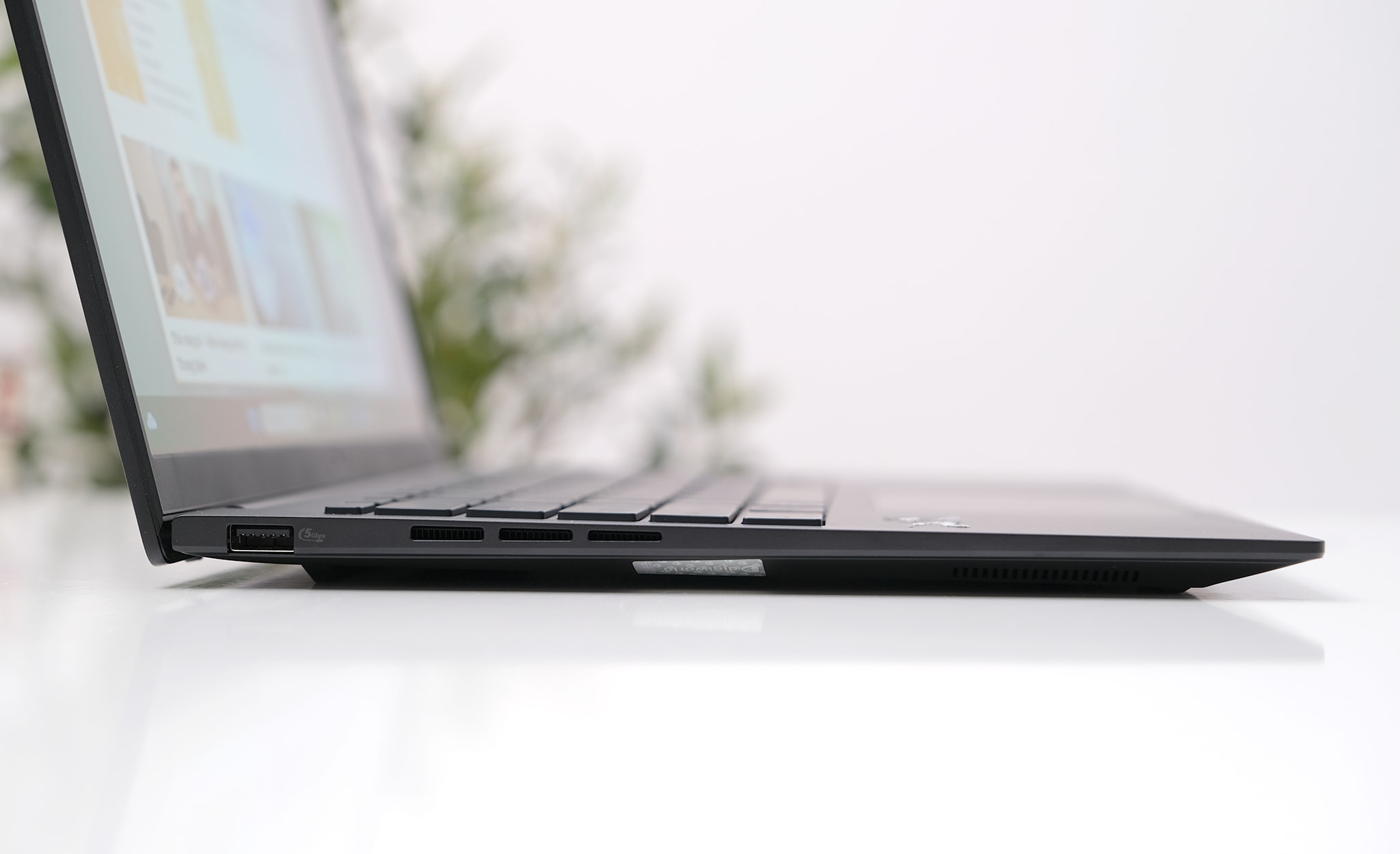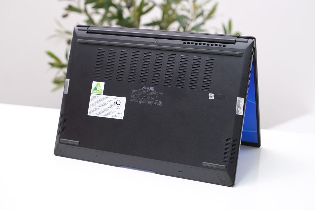 Laptop OLED của Asus có thiết kế mặt dưới sử dụng nhiều khe hở để tăng tối đa khả năng tản nhiệt. Trong đó, khu vực bên phải có quạt tản nhiệt thổi thẳng qua khe giúp đưa hơi nóng ra ngoài trực tiếp nhanh hơn. Khi hoạt động với các tác vụ thông thường như văn bản, đọc nội dung hay xem video, máy hoạt động yên tĩnh, hiếm khi chạy quạt tốc độ cao.