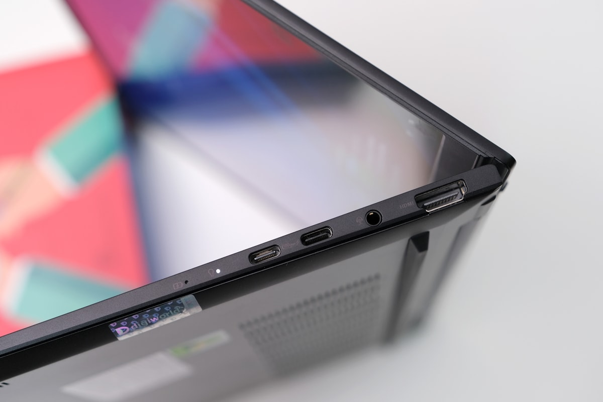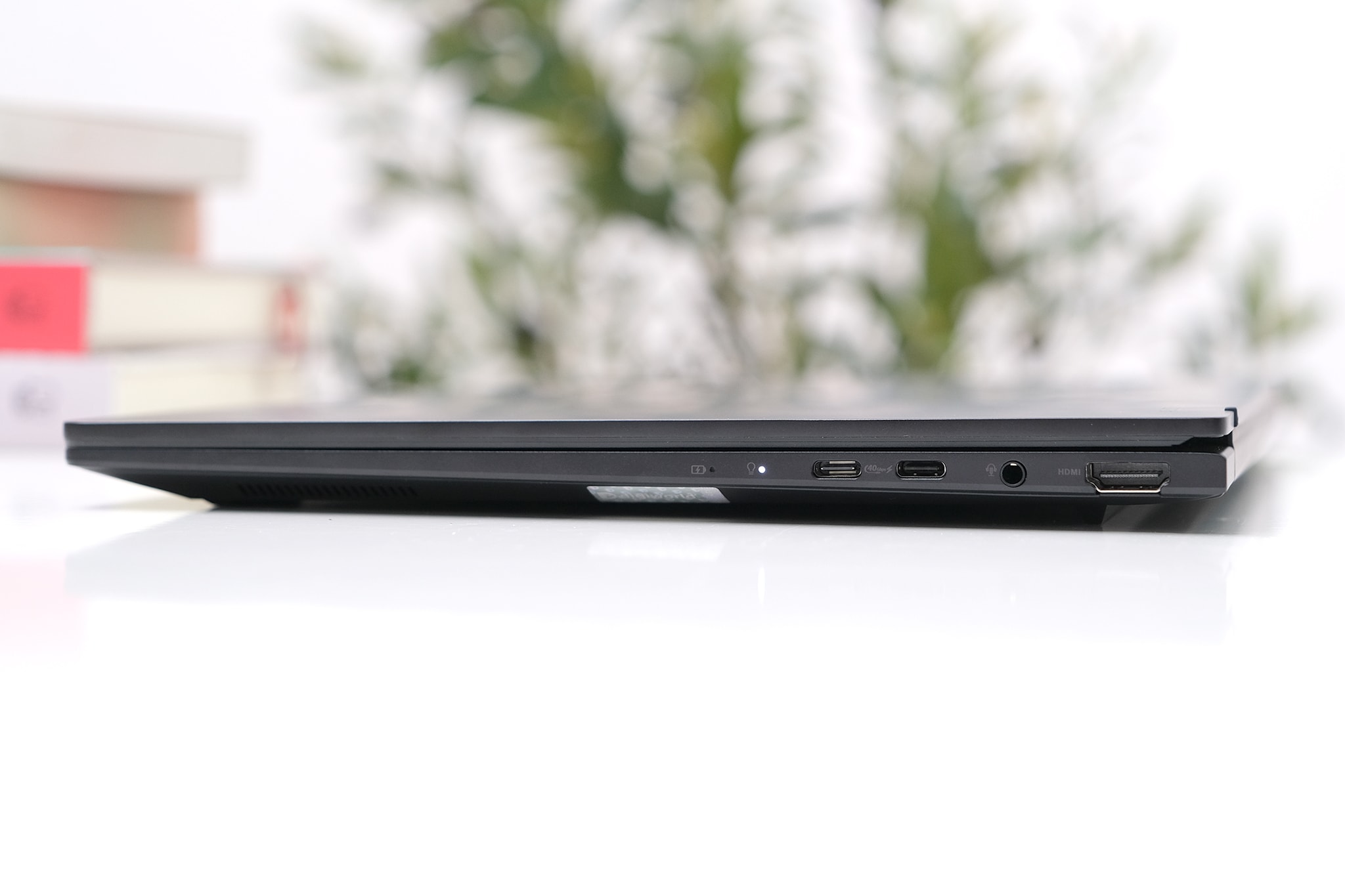 So với thông số độ mỏng 1,59 cm, nhìn thực tế ZenBook 14 còn cho cảm giác mỏng hơn do máy được vát đều ở các cạnh thay vì chỉ phần mặt trước. Các viền bên vừa đủ cho các kết nối phổ biến, bao gồm cả cổng HDMI. Tuy nhiên, cách bố trí các cổng kết nối chưa thực sự hợp lý khi dồn hết sang cạnh phải, bao gồm cả hai cổng USB-C. Nếu người dùng kết nối thiết bị ngoại vi, sạc cùng lúc sẽ dễ gây bất tiện, đặc biệt ở vị trí gần tay cầm chuột ngoài.
